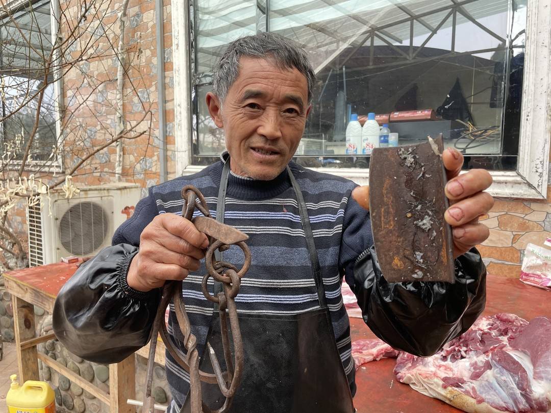 杀一头猪,需要什么样的刀?“不光是刀!”他边说边拿出一箩筐“杀猪工具”,给封面新闻记者科普:“这是连环钩,用来勾猪吊猪的;这是杀猪刀,宰杀时用的;这是碎肉刀、砍刀,还有刨子,是用来刮猪毛的;一共近10件工具,各有用处。”
