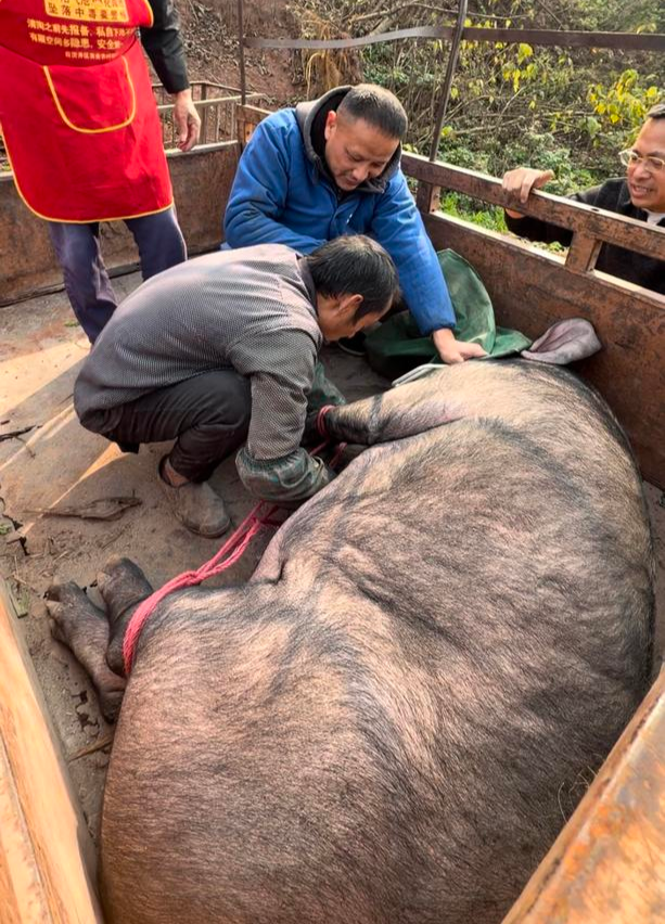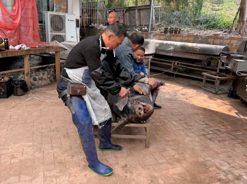 他介绍,尤其是这么大的猪,最难的环节是“活捉”捆绑。多来几个力气大的壮汉是必需的,猪一定会乱跑,有个技巧,要用口袋把它的视线挡住,它才会安静下来。
