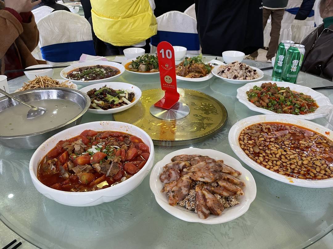 当天的“杀猪菜”一共有10菜1汤:蒜苗回锅肉、大葱炒猪肝、小煎三线肉、红萝卜烧排骨、凉拌心舌肚猪头、酸辣血旺、黄豆烧肥肠、土猪香肠、炝炒红油菜、凉拌藕、心肺猪脚汤。