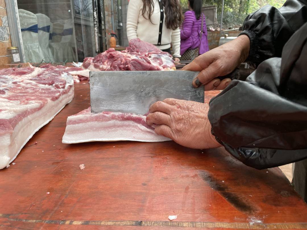 “一头400斤的大肥猪,还不算最重的猪,也至少要4个大汉才按得稳,再轻点的猪可以不用捆。按头的人用铁钩勾住嘴部,另外主刀的人杀。”有30多年经验的杀猪匠杨国贤介绍,有经验的杀猪匠,都是一刀割断颈部动脉,等血流干后就开始分解。“一般杀一头猪,需要大约两个小时。”