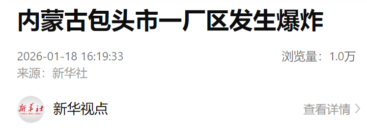 记者从内蒙古包头市委宣传部了解到,1月18日15时许,包头市西侧一厂区发生爆炸,周边地区有明显震感,伤亡情况暂不详。