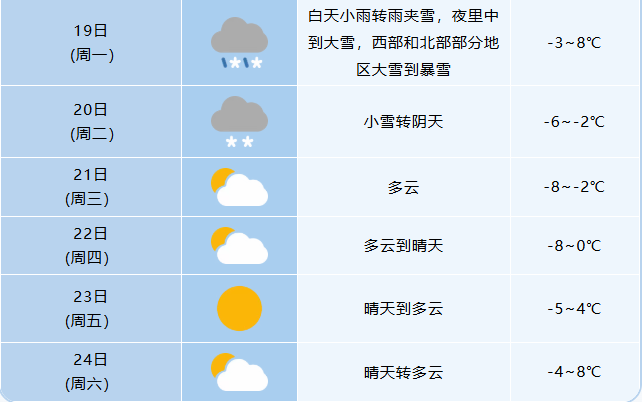 预计19日,阜阳、亳州、六安、淮南等地有暴雪(降雪量10-15毫米),淮北、宿州、蚌埠、合肥、滁州等地有大雪(降雪量5-10毫米)。大别山局部有冻雨。注意防范!