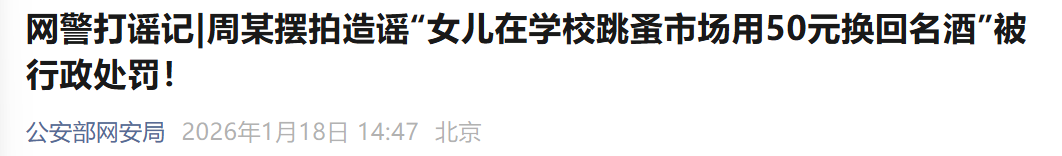 经查,上述视频为虚假内容,系网民周某(男,32岁,无业)为博取关注、吸引流量,编造、摆拍并发布了“女儿在学校跳蚤市场用50元换回名酒”的不实信息,导致该虚假信息大量传播,引发网民关注,扰乱网络空间秩序。