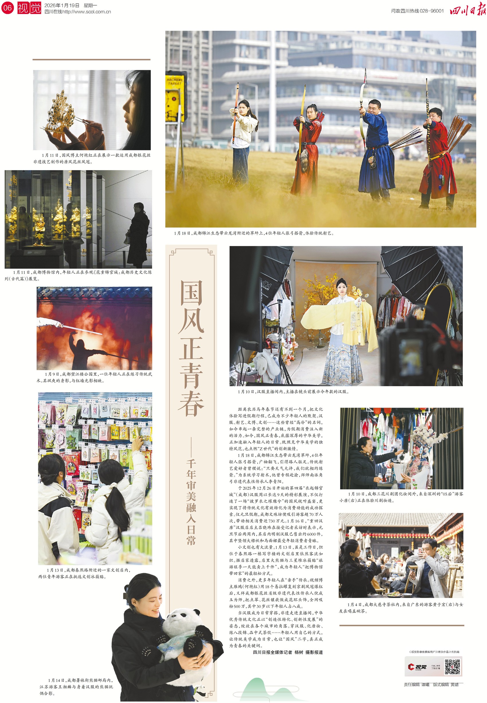 汉服成为出行穿搭,点翠、花丝镶嵌直播吸粉数百万,唐妆与中式茶饮成为生活一部分……今日,无数年轻人正用自己的方式,实践着中华优秀传统文化“创造性转化、创新性发展”,让“国风”变成青春的关键词。今日六版,看新一代巴蜀儿女是如何让千年审美融入烟火日常。
