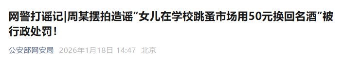 经查,上述视频为虚假内容,系网民周某(男,32岁,无业)为博取关注、吸引流量,编造、摆拍并发布了“女儿在学校跳蚤市场用50元换回名酒”的不实信息,导致该虚假信息大量传播,引发网民关注,扰乱网络空间秩序。