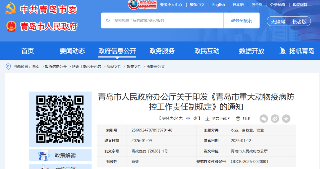 点击查看>>>青岛市人民政府办公厅关于印发《青岛市重大动物疫病防控工作责任制规定》的通知