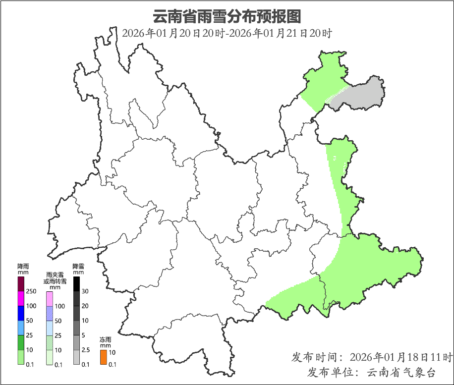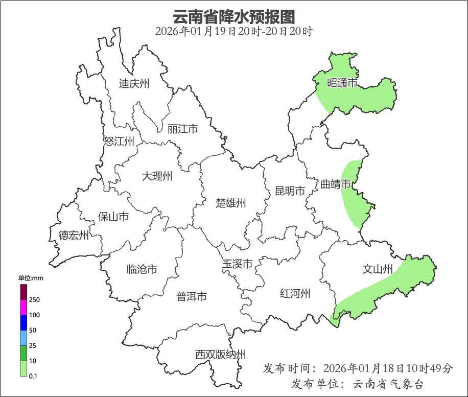 1月18日20时到1月19日20时:昭通市北部阴有小雨,文山州南部多云有阵雨,其他地区晴。
