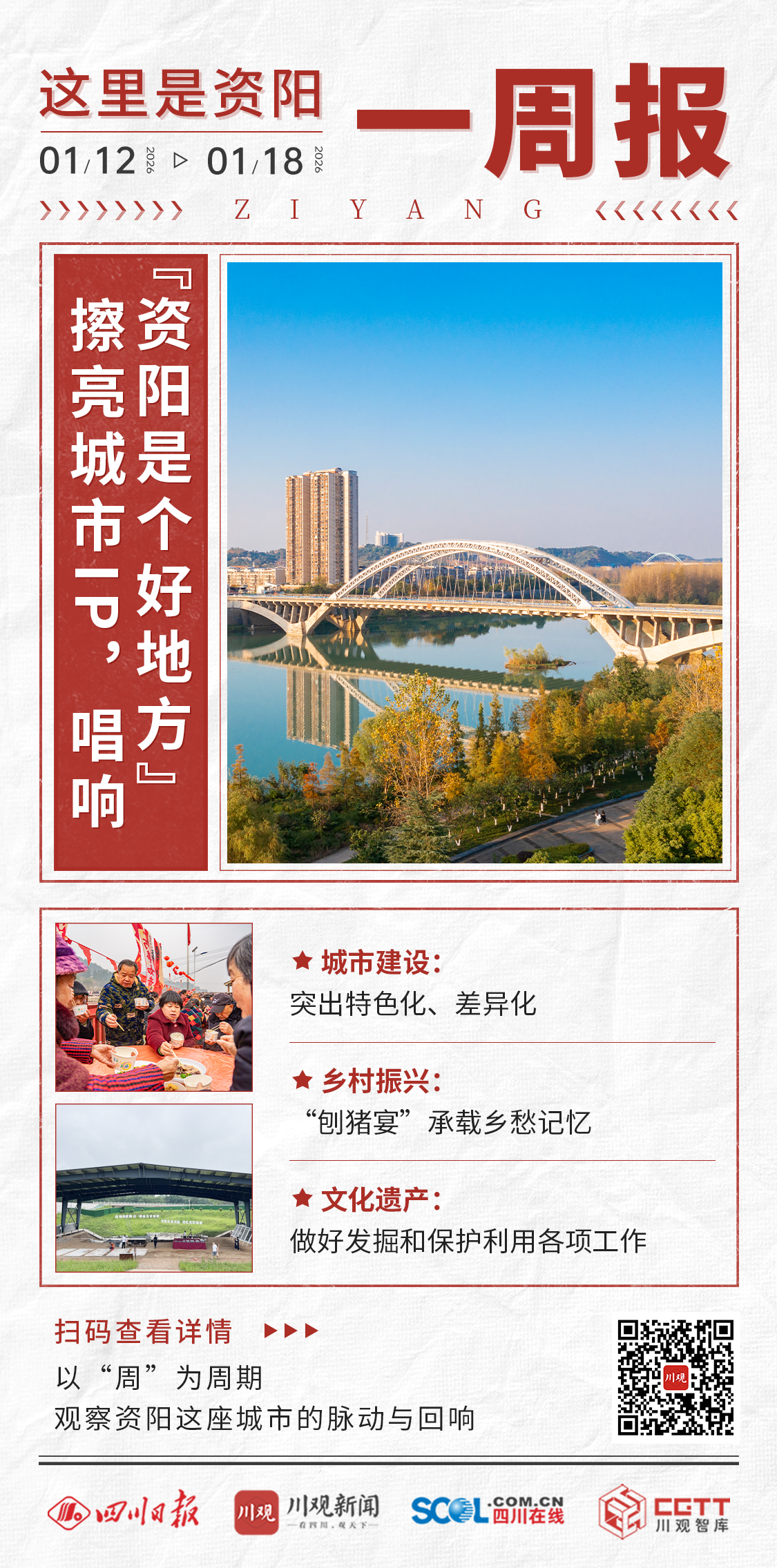 本周是2026年第三周,时间为1月12日—1月18日。这一周里,资阳以一场市委城市工作会议拉开序幕。会议将“特色化、差异化”的发展理念融入未来城市蓝图,着力塑造城市独特标识,进一步展现“资阳是个好地方”的鲜明形象。