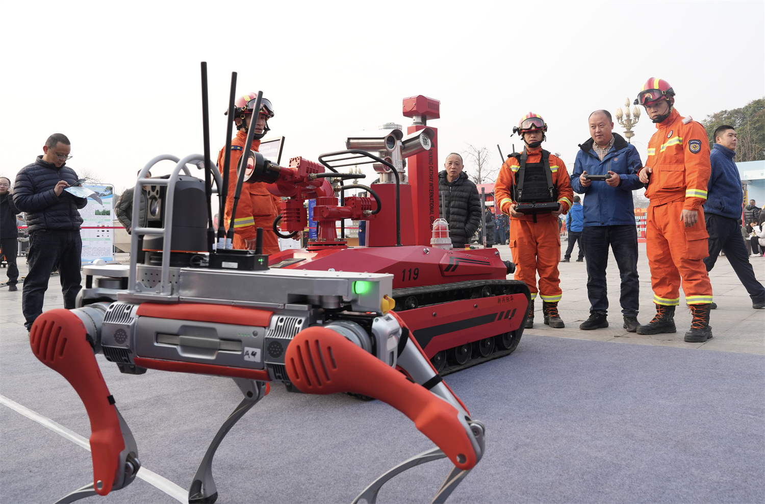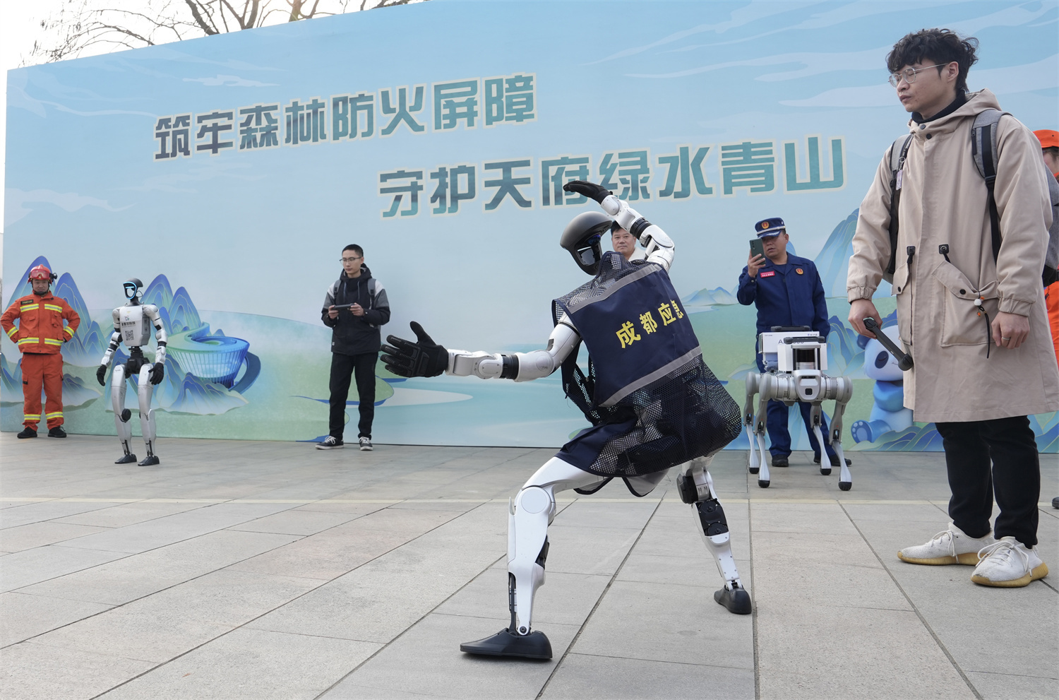 装备展示区内,40余种轻重型前沿科技装备整齐陈列,具身智能机器人、尾座式无人机、空投精确制导灭火弹等空天地的装备一应俱全。“这个无人机能飞多高?灭火范围有多大?”市民张先生好奇地向工作人员询问。“这是浇灌式空中以水灭火装置,可以悬停在悬崖等复杂地形,实现精准浇灌作业,已在凉山州重点防火区域投入实战应用。”工作人员讲解道。“这个装置配备了快速注水接口,70公斤水可在10秒内加注完毕,在30秒内喷洒形成暴雨式覆盖效果,800米内单次作业循环仅需90秒,极大提升了灭火效率。”围观群众频频点头,纷纷感叹科技为森林草原防火灭火注入的强劲动能。