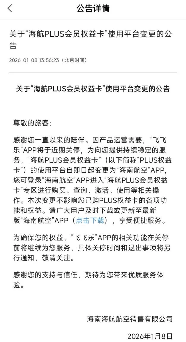 海航在此次公告中表示,“飞飞乐”App具体关停时间和退出事项将另行通知。但“海航PLUS会员权益卡”依然正常查询、购买,使用平台变更为海南航空App,本次变更不影响已购PLUS权益卡的功能和权益。