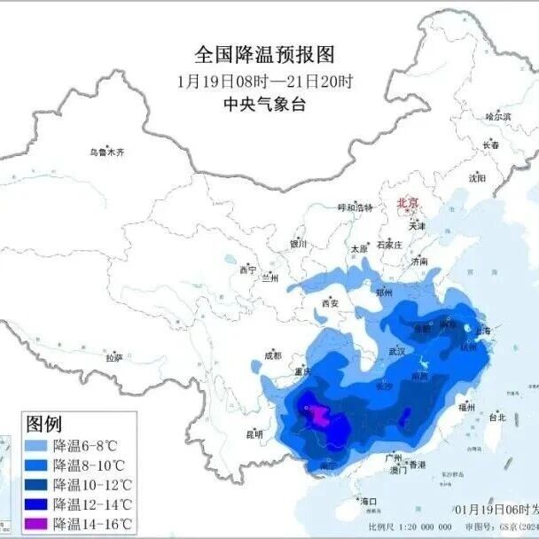 预计,1月19日08时至1月21日08时,黄淮中南部、江汉大部、江淮、江南大部、西南地区东部、华南大部等地气温下降6~10℃,其中,陕西中部、山西南部、河南中东部、安徽、江苏大部、上海、浙江、湖北大部、湖南、江西、福建西部和北部、广东北部、广西、重庆、贵州等地部分地区降温可达10~14℃,局地降温可达16℃以上。