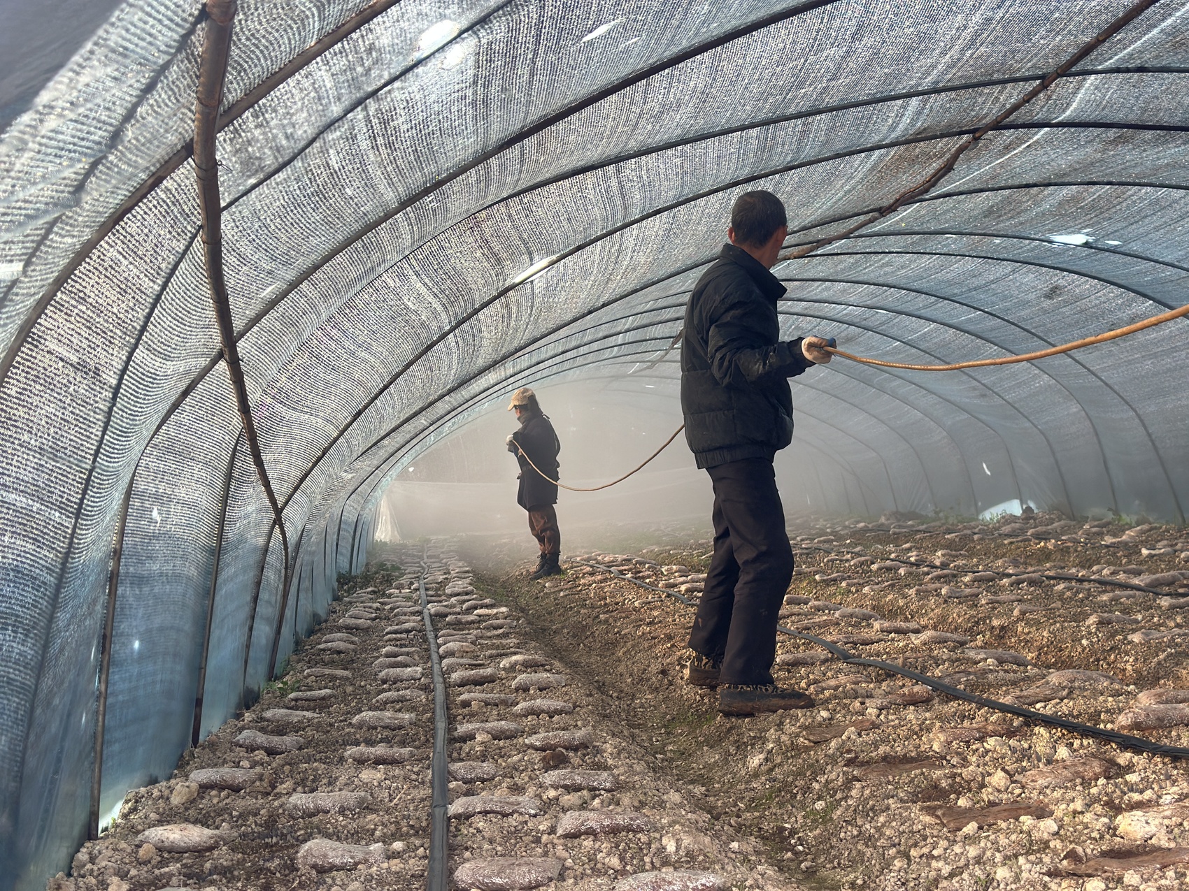 易建芝(左)与工作人员为羊肚菌温室大棚增湿。