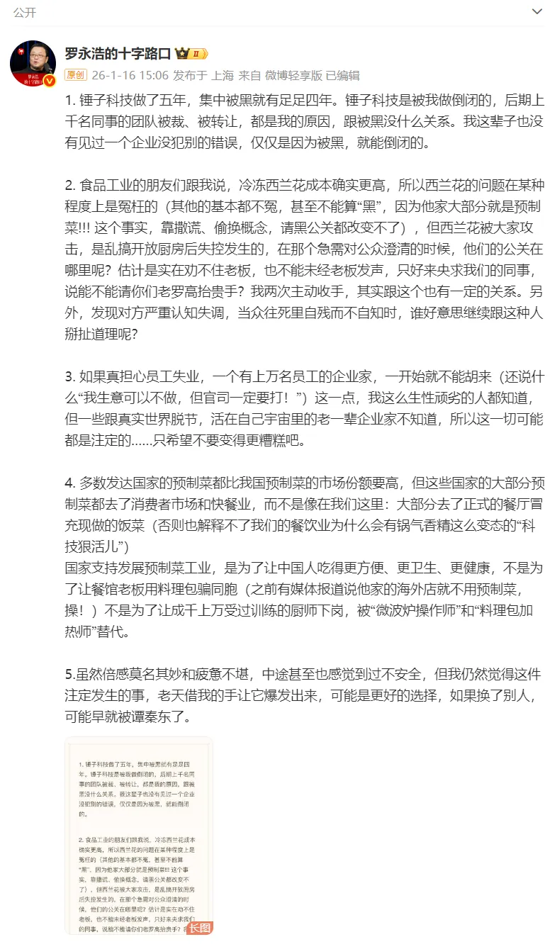 此前,罗永浩就贾国龙在朋友圈发文证实西贝计划关闭102家门店一事,在个人社媒账号发布长文回应: