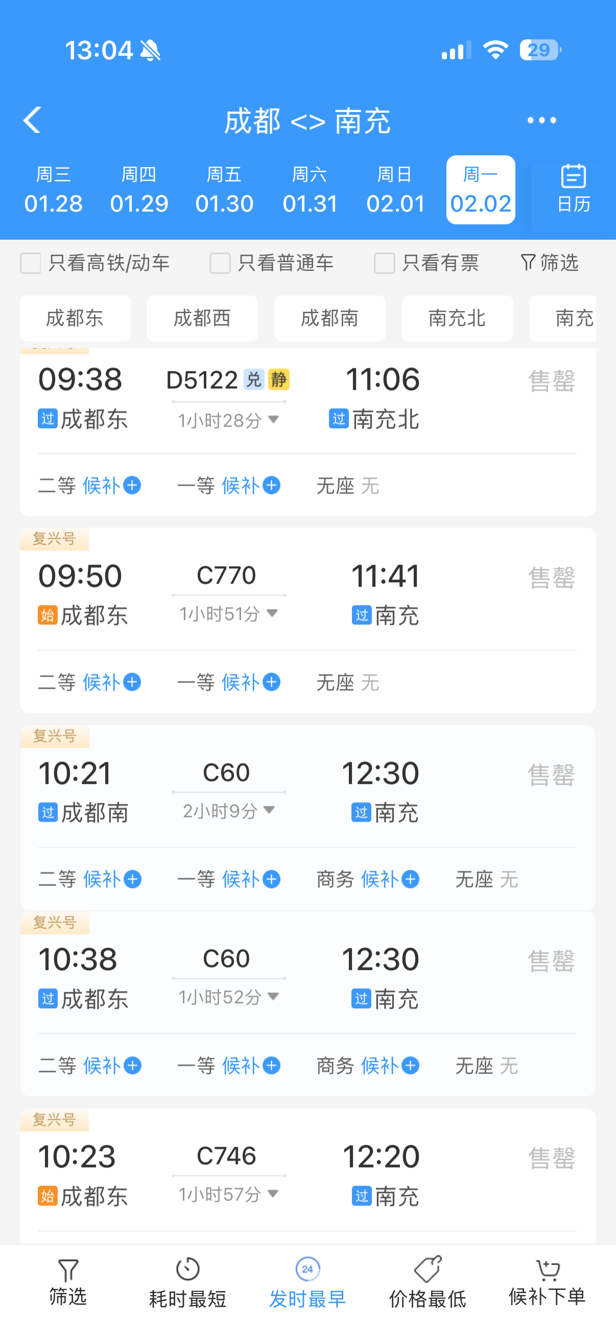 同程旅行数据显示,截至1月19日上午,春运首日火车票搜索及预订热度最高的十大始发地分别为:广州、重庆、成都、北京、深圳、郑州、西安、杭州、上海、长沙。记者查询发现,截至今日13时,2月2日从成都至南充的多趟列车车票已售罄。