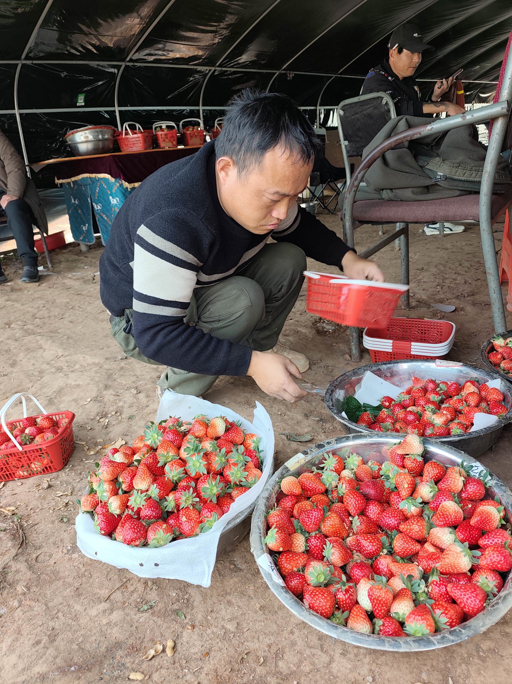 1月16日,在成都天府新区太平街道鹿林村,业主巫德江正在组织工人采摘草莓。一颗颗红艳艳的草莓煞是令人喜欢,尝一口,一股香甜回味无穷。