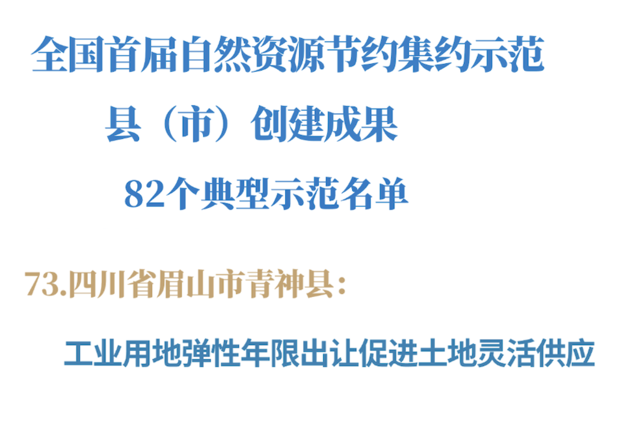 近日,全国首届自然资源节约集约示范县(市)创建成果发布,82个县(市)脱颖而出。其中,眉山市青神县凭借《工业用地弹性年限出让促进土地灵活供应》典型案例成功入选。