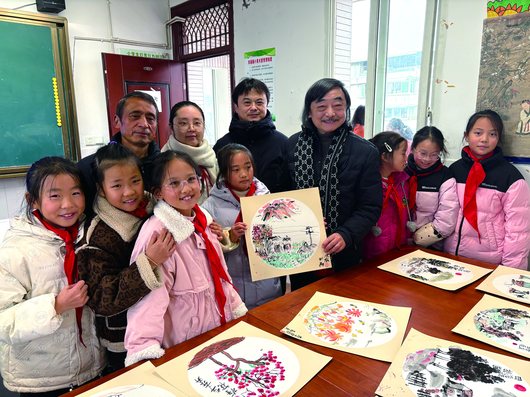 林栩与双福镇小学学生在指画作品前合影 李怡霏 摄