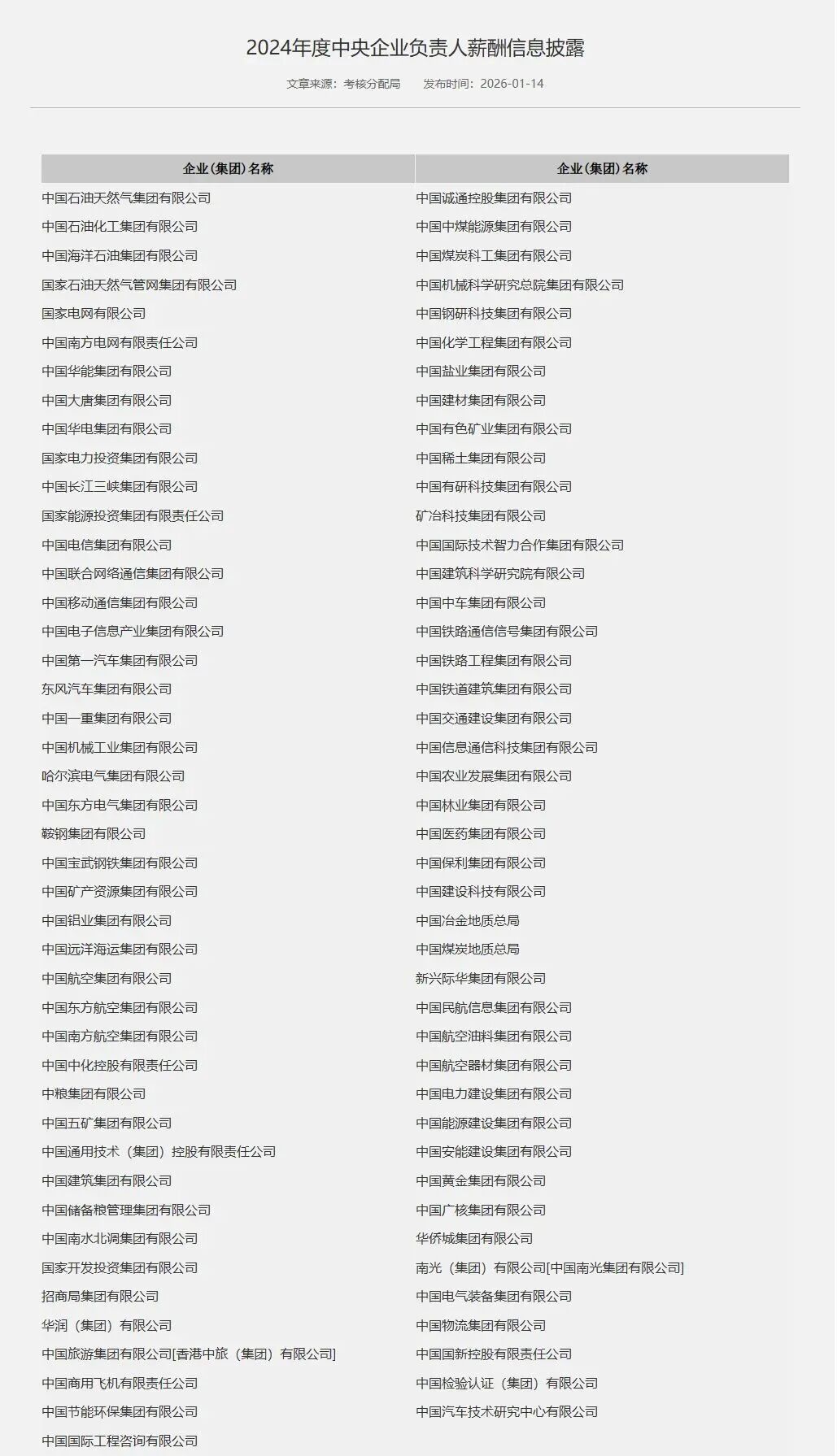2026年1月14日,国务院国资委网站通过提供各中央企业薪酬信息披露网页链接的方式,披露了所监管的80多家央企负责人2024年度薪酬信息。