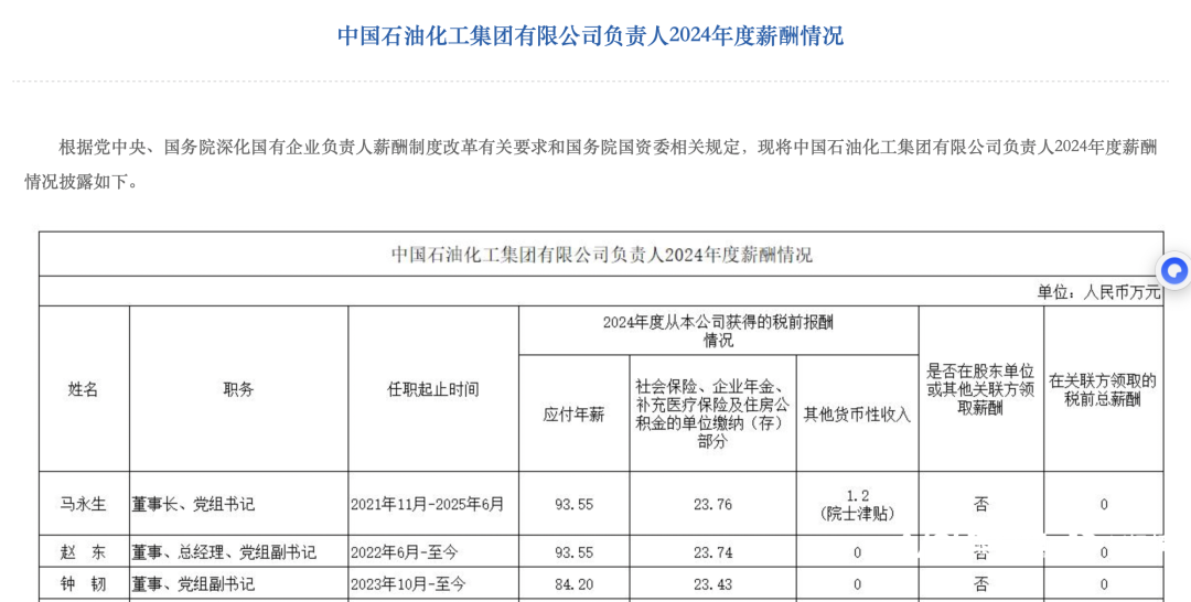 中国海油董事长汪东进以96.69万元应付年薪排名能源类第二,税前报酬超123万元;中石化董事长马永生、总经理赵东应付年薪均为93.55万元,马永生同样享有1.2万元院士津贴,税前总报酬118.51万元,位列能源类第三。