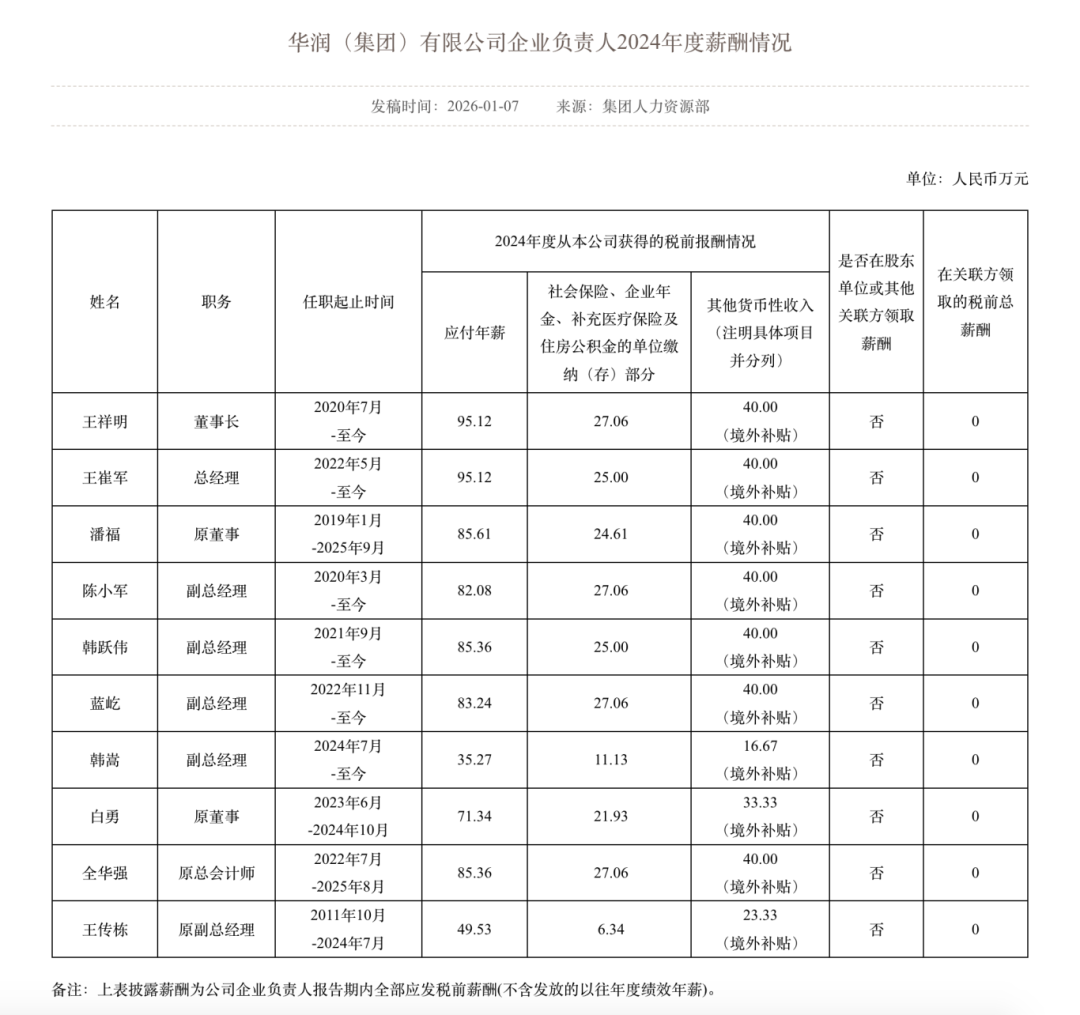 其中,招商局董事长缪建民应付年薪达94.64万元,社保及年金等单位缴存部分34.68万元,境外工作补贴为40.00万元;华润集团董事长王祥明应付年薪为95.12万元,社保及年金等单位缴存部分27.06万元,境外工作补贴为40.00万元。