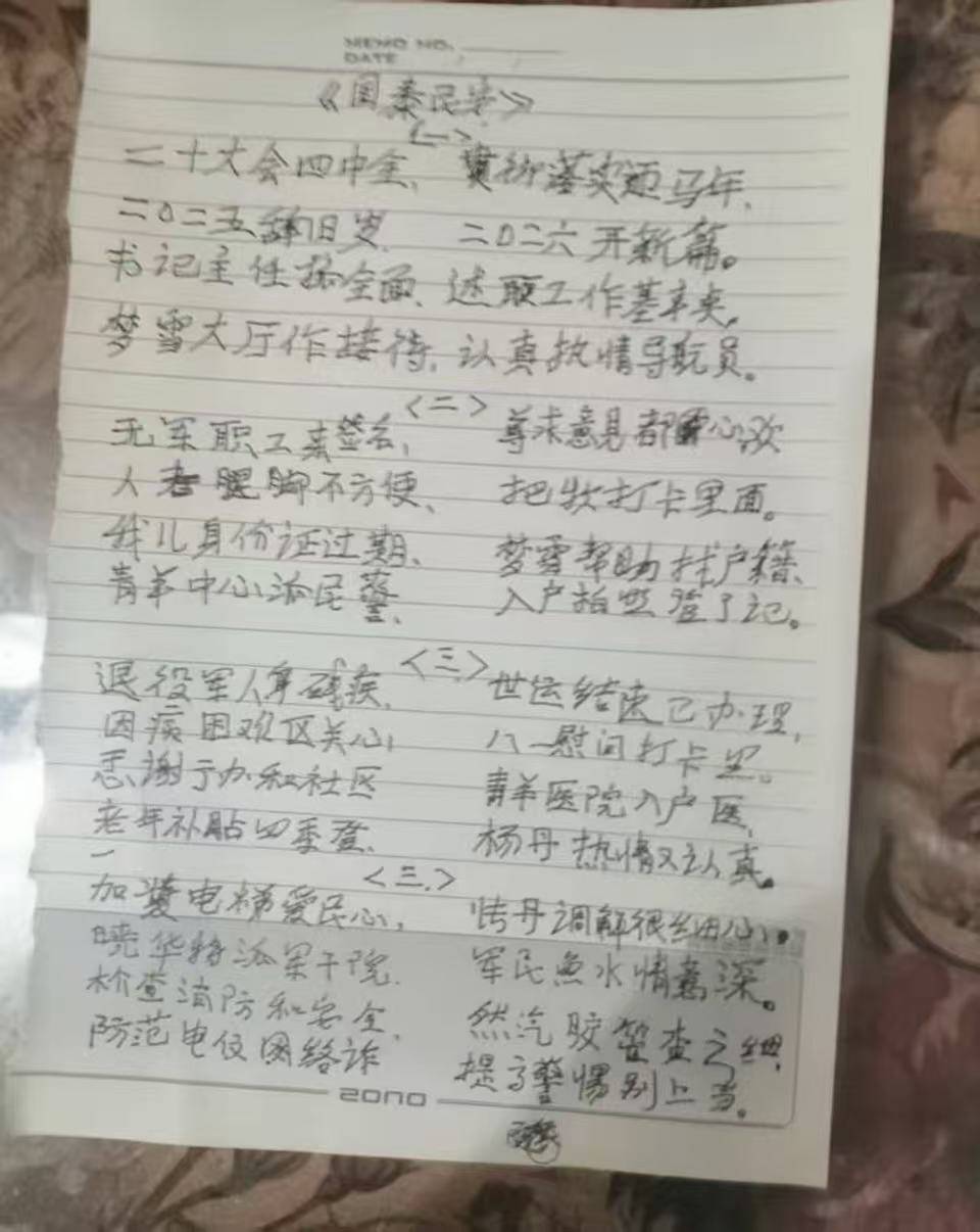 记者了解到,社区对老人的关怀远不止于此。一年两季不断档的高龄补贴办理、节假日里的慰问关怀、加装电梯时的耐心调解、消防燃气安全的定期检查、防诈骗知识的反复宣传、无军籍职工年度关心慰问、坝坝红色电影温馨放映……这些细致的服务,都被老人一一记在心中,化作笔端的感激。