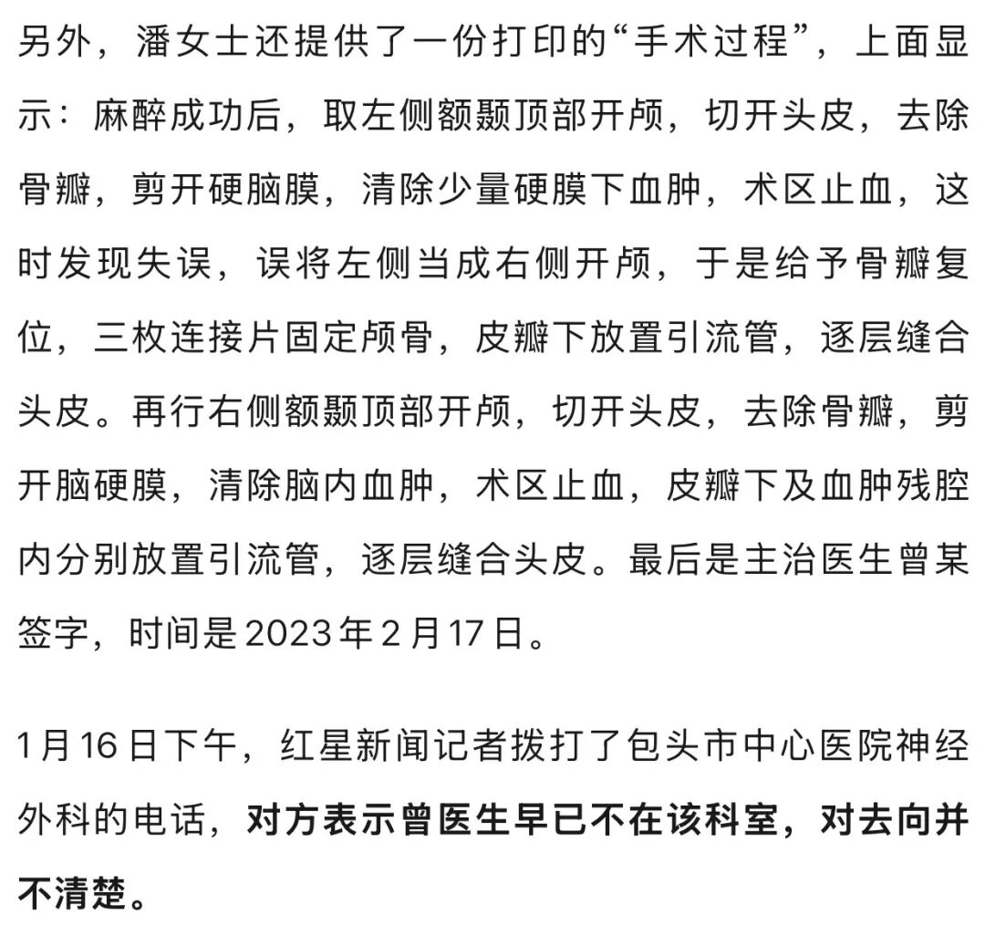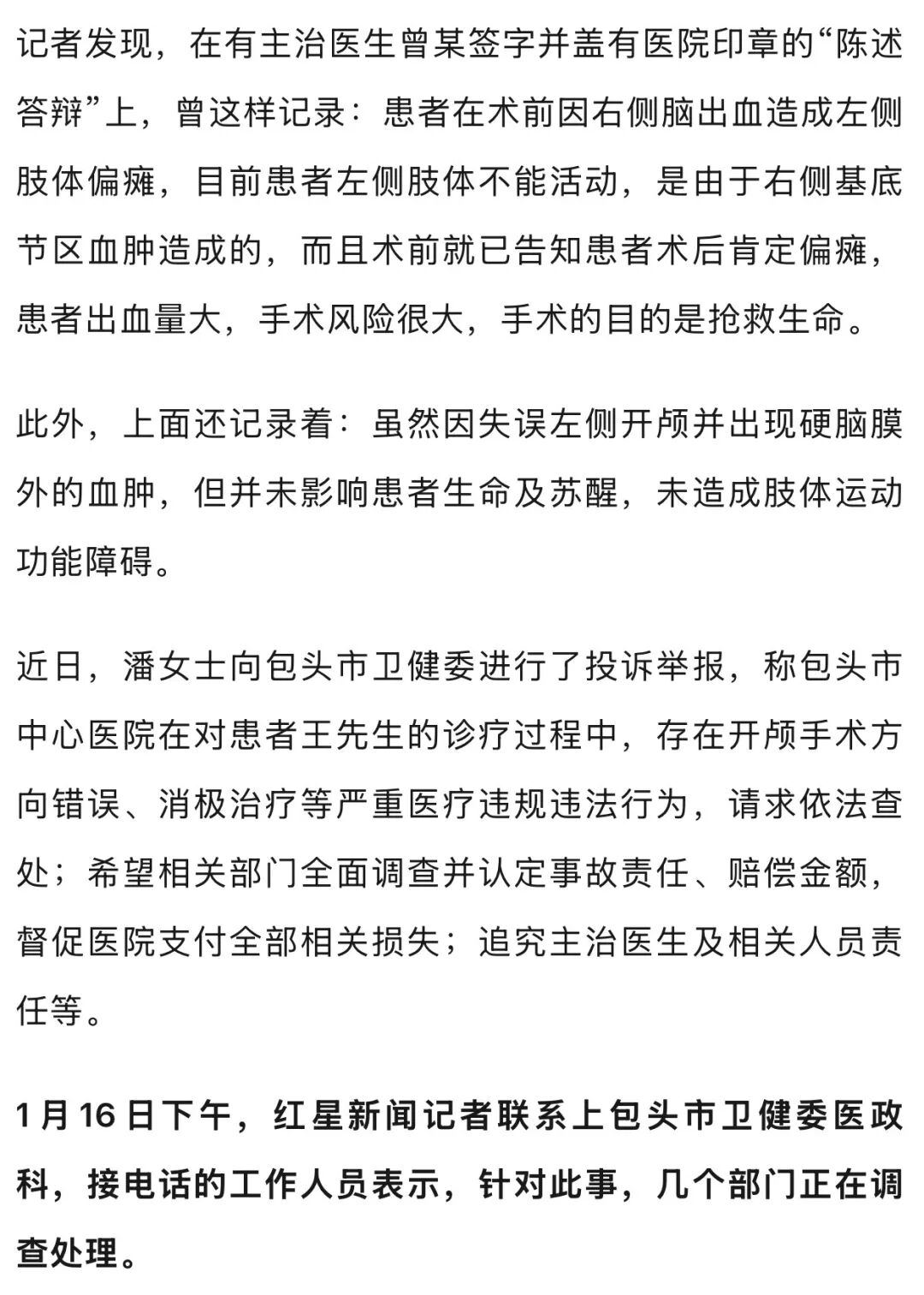 潘女士向红星新闻记者提供了一份盖有包头市中心医院印章的“陈述答辩”,上面显示,手术中存在失误,先开左侧后再进行右侧开颅血肿清除术……失误将患者左侧开颅,术后出现左侧硬膜外血肿,曾建议家属再次行手术清除,后家属不同意手术,一直保守治疗……最后有主治医生曾某的签字。