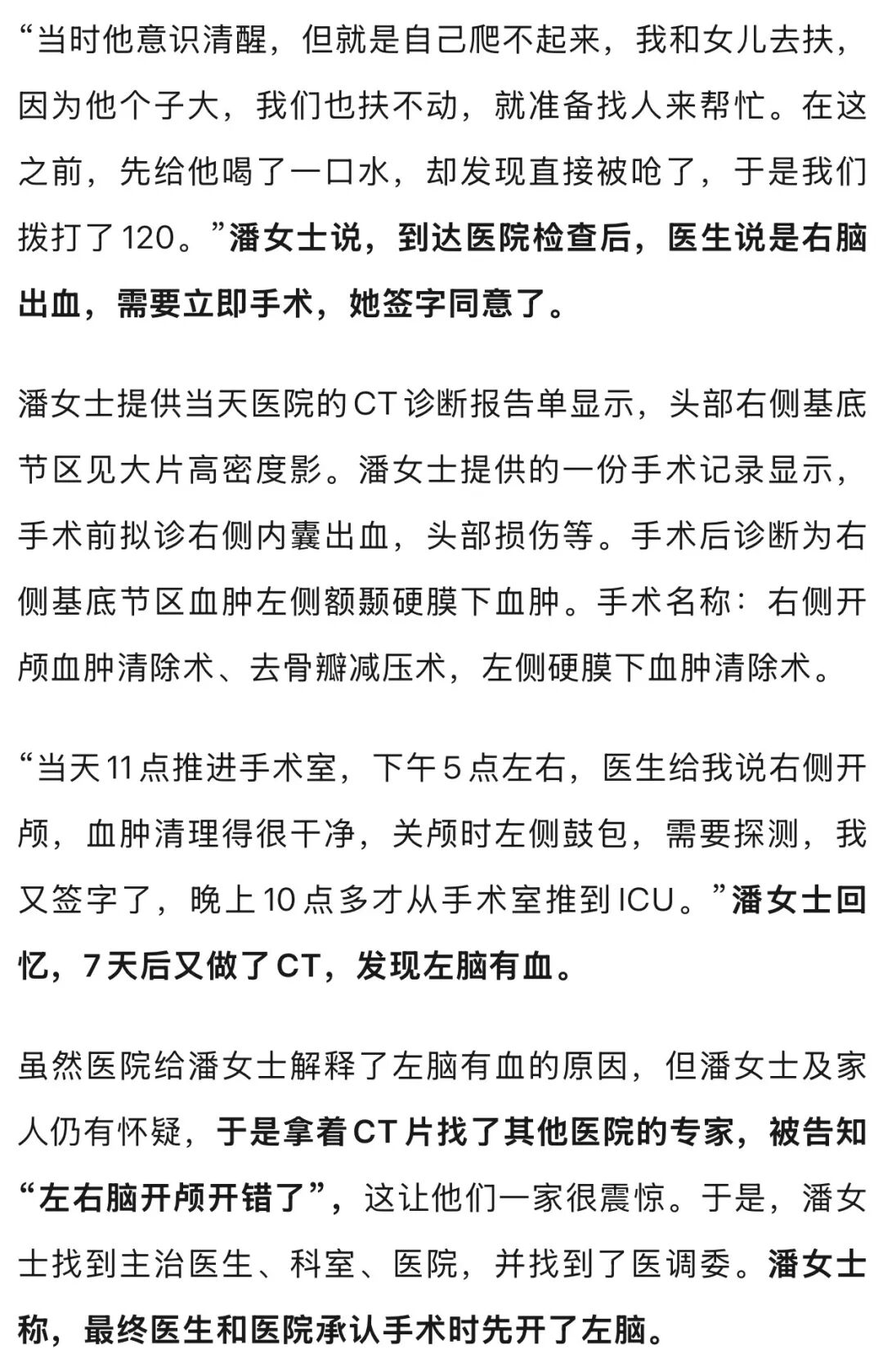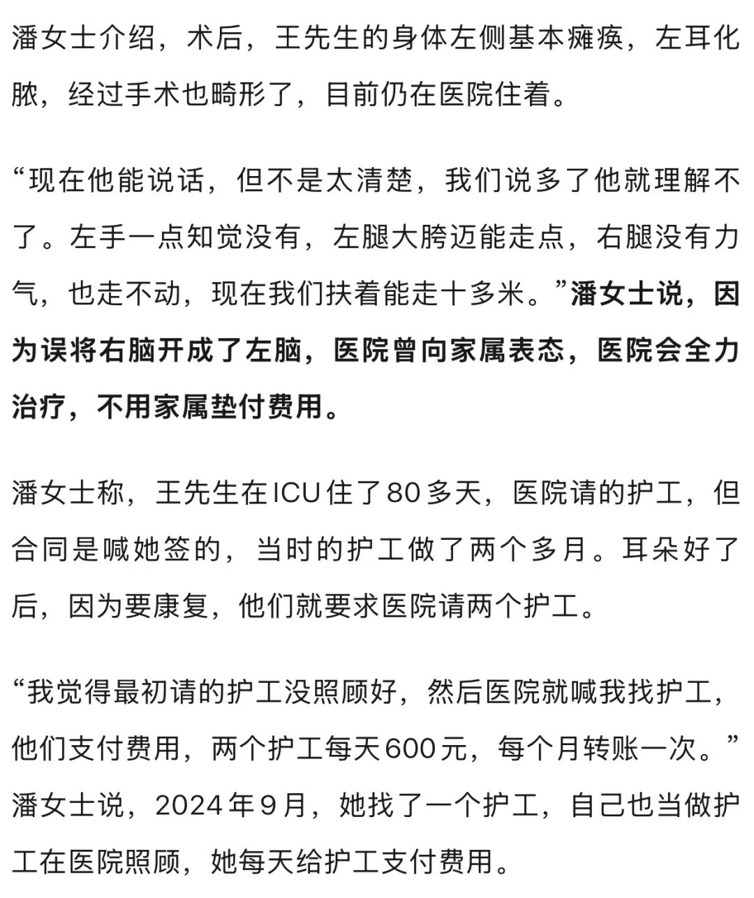 红星新闻,公众号:红星新闻“男子右脑出血被开左脑,医生发现出错又开右脑”,家属:医院每月支付护工费,曾提出300万元赔偿被拒;当地称多个部门正调查