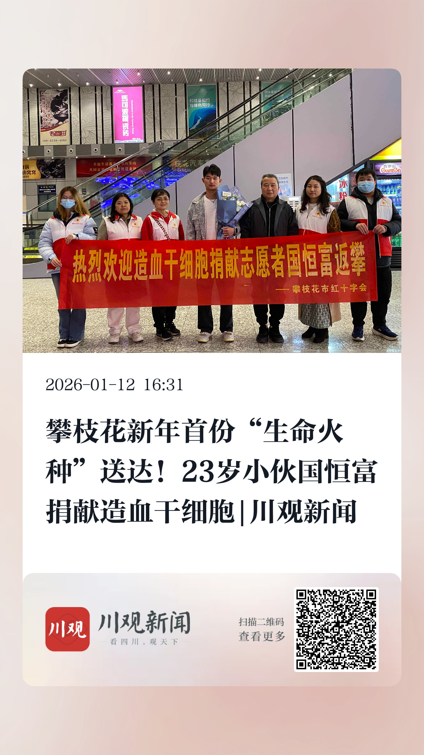 2026年1月9日晚,带着捐献后的欣慰与安心,23岁小伙国恒富从成都顺利返回攀枝花。就在前一天,他在四川省人民医院成功捐献造血干细胞,为远在北京接受治疗的一名急性淋巴白血病患者,送去了重获新生的希望。这不仅是攀枝花市2026年首例造血干细胞捐献,也是该市第42例、四川省第948例、全国第21916例捐献,让“生命火种”在新年伊始续写温暖篇章。