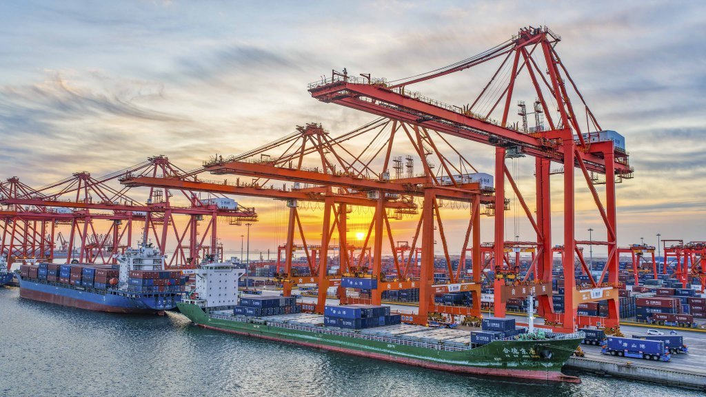 1月19日,轮船停泊在河北省唐山港京唐港区集装箱码头进行装卸作业(无人机照片)。