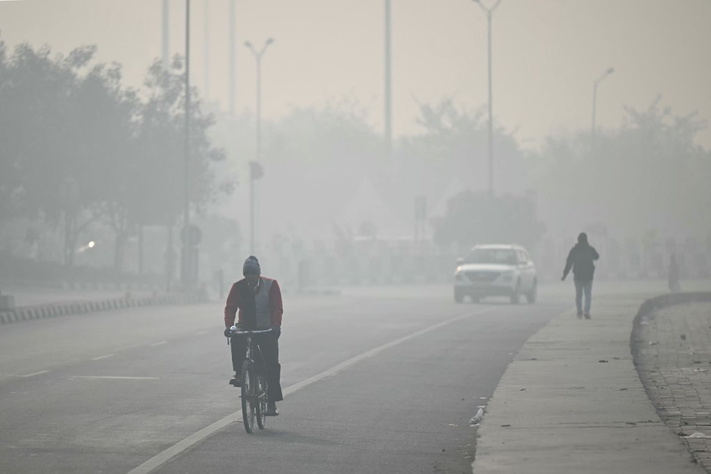 1月19日,在印度新德里,人们在雾霾天气下出行。
