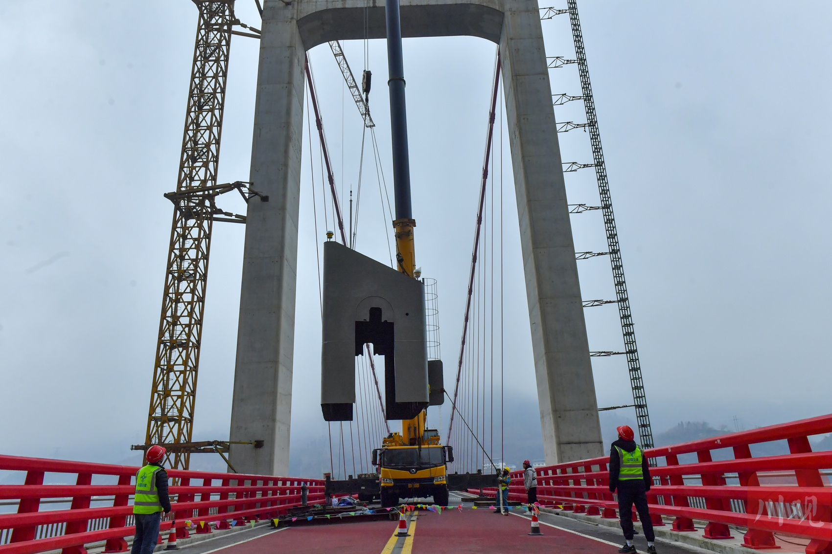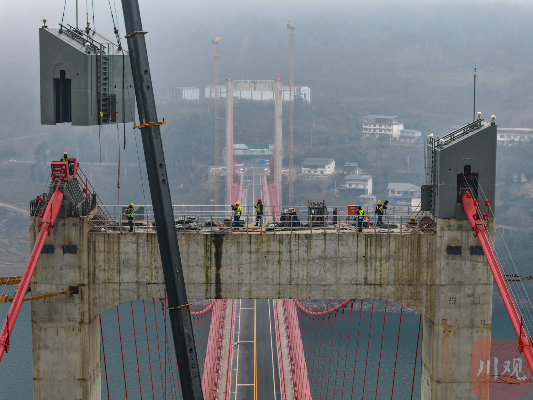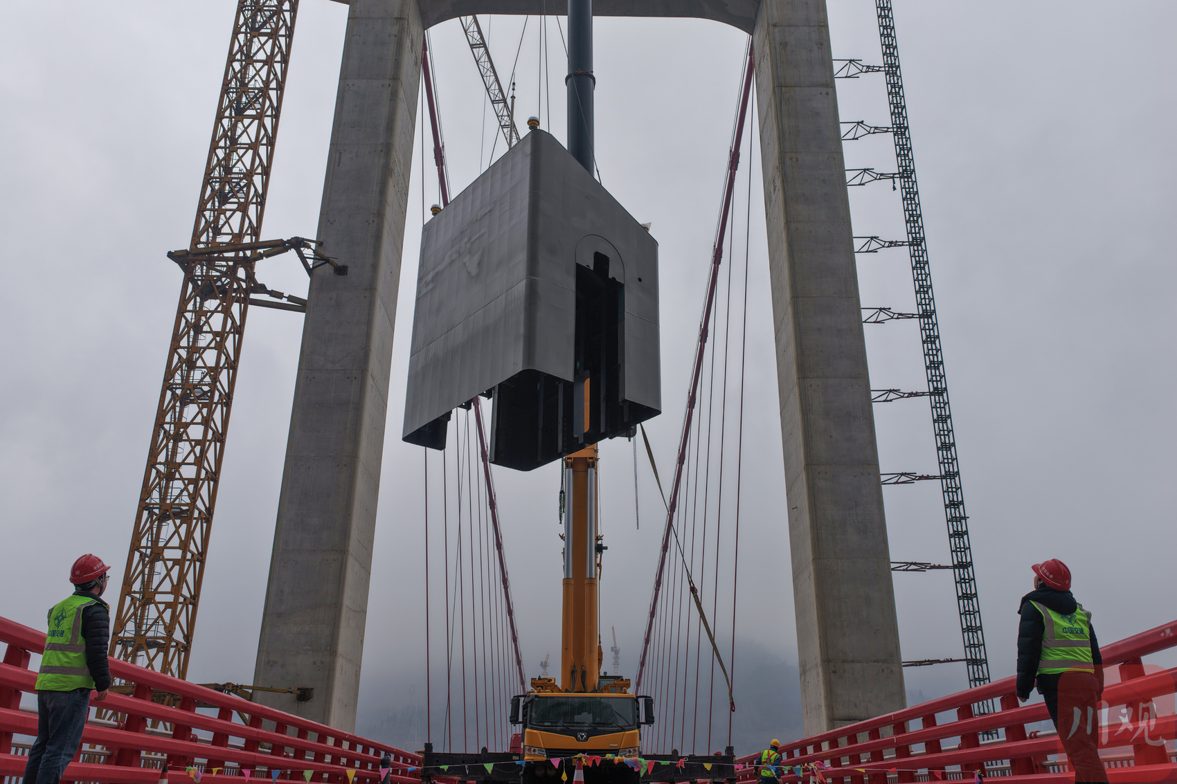 2026年1月19日,国道317线友谊隧道至汶川映秀段改建工程紫坪铺特大桥施工现场,工人正在大桥主塔塔冠吊装。