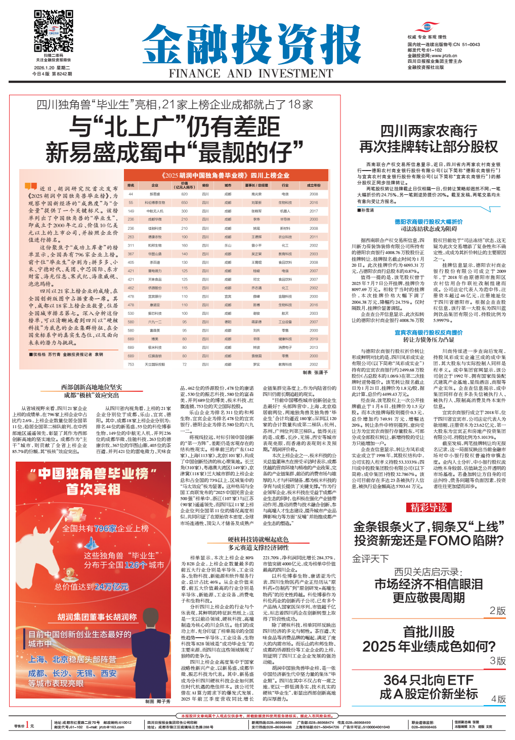近日,胡润研究院首次发布《二零二五年胡润中国独角兽毕业榜》。四川以21家上榜企业的成绩,在全国创新版图中占据重要一席。