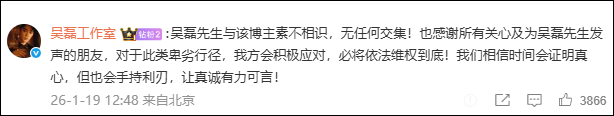 该网络用户所发布关于吴磊先生的言论为毫无事实依据的谣言!各平台涉及吴磊先生的不实信息,我方均已委托律师依法完成证据固定,并将坚决通过一切法律途径追究侵权者责任。