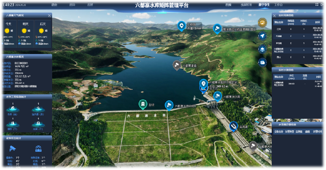 展示六都寨水库三维场景下的延绵起伏的山体、天然河道、人工修葺河道的总体布局、各项水工建筑物、楼宇、乡村的整体布局以及六都寨灌区的总体概貌。同时在该界面下展示水库的各项数据汇总统计信息。