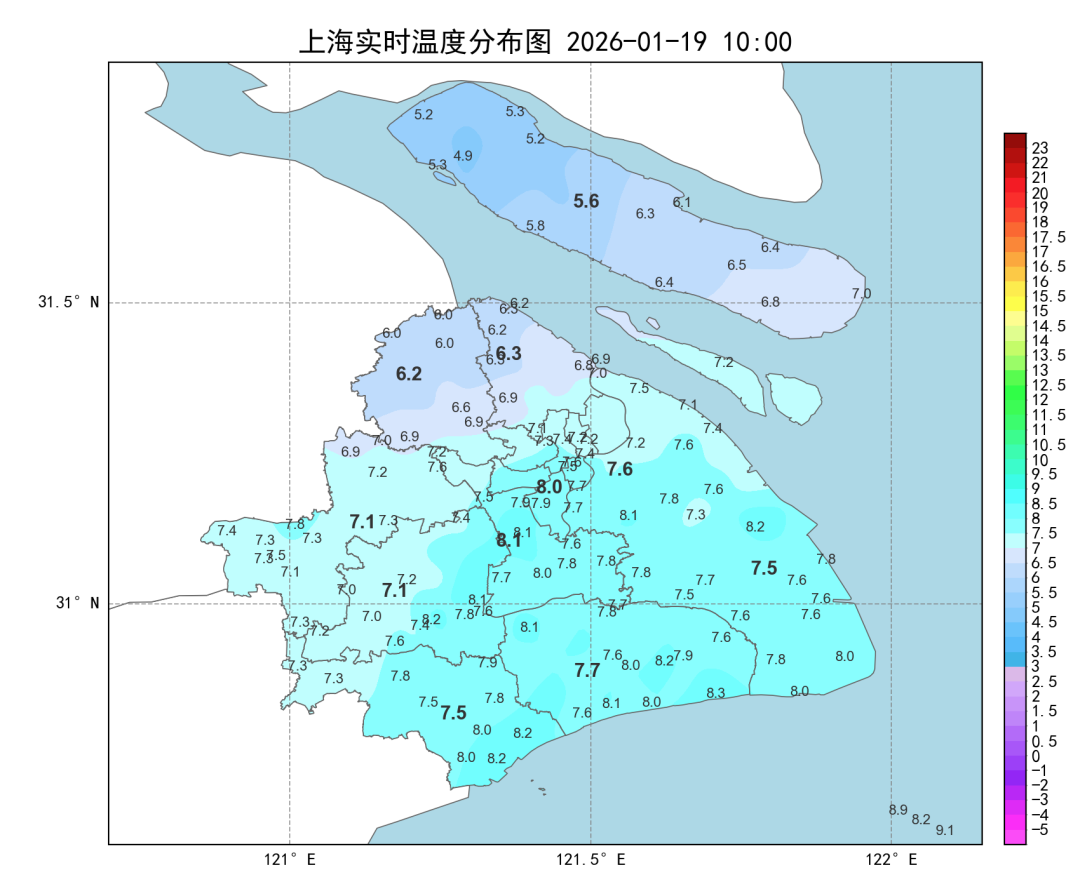 周二至周四本市将出现三天持续低温天气,最高气温在3~5C;周四(22日)早晨将出现此次冷空气过程的极端最低气温,市区零下1℃左右,有薄冰,郊区零下6℃~零下3℃,有冰冻或严重冰冻。周四白天风力明显减弱,周五起以晴好天气为主,气温逐步回升。
