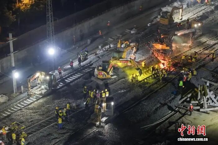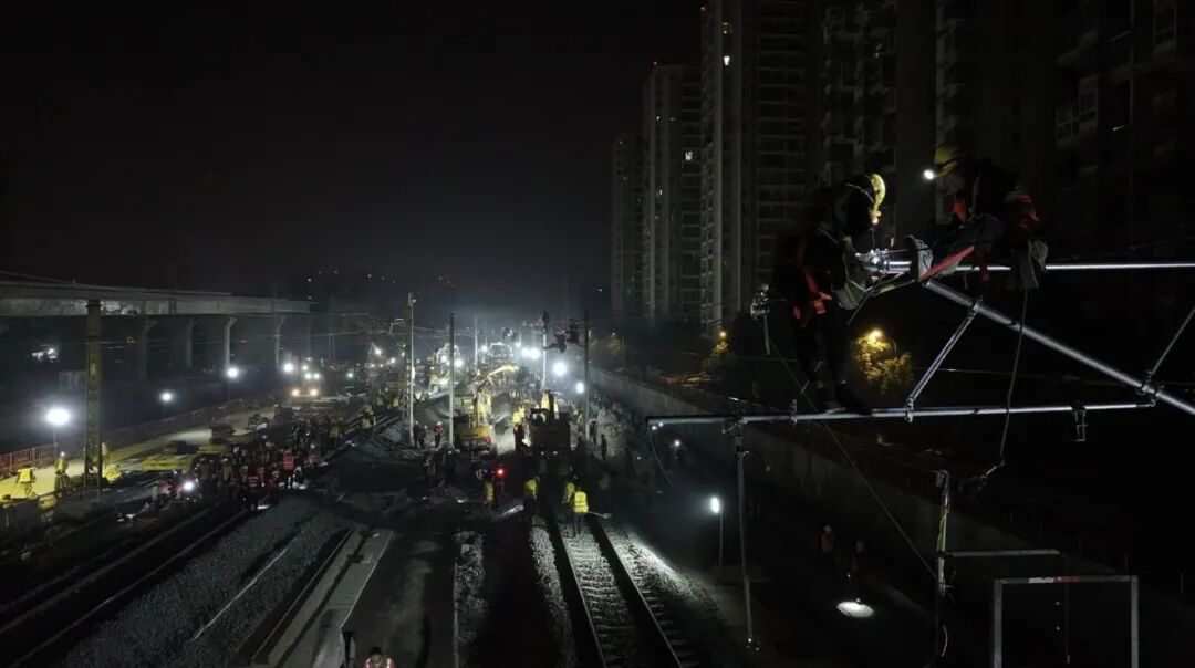 中铁八局成都车站扩能改造项目经理吴朝旭介绍,此次拨接施工涉及工务、电务、供电多个专业立体交叉施工,需要实现枢纽地区铁路正常运输与工程建设的同步推进。项目团队在拨接施工中采用“沙盘推演”、“模块化预拼装+分段突击”施工模式、“预铺轨排横移+精准拨接”的工艺,将原来需要5小时的作业时间压缩至了3小时,施工效率显著提升。