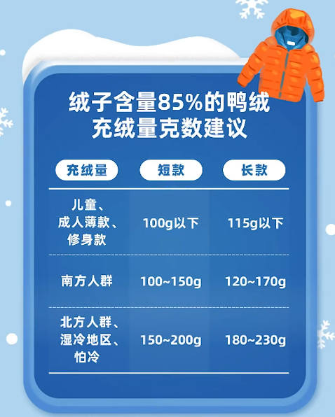 某专业测评博主曾公开科普,充绒量并非越大越好,由于羽绒服的保暖性能主要受填充物之间的间隙影响,“充少了不保暖,充多了反而因绒子之间太拥挤,导致空气层减少,保暖性能降低。”业内给出的绒子含量85%的鸭绒充绒量克数建议为:南方人群短款为100-150克、长款120-170克,北方人群、湿冷地区、怕冷人群短款为150-200克、长款180-230克。