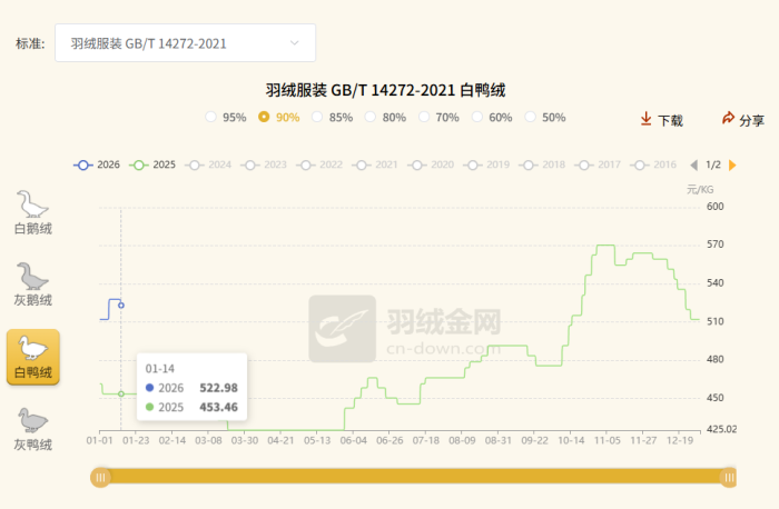 记者查询第三方检测平台数据发现,截至1月14日,羽绒服装GB/T14272-2021白鸭绒报价为522.98元/公斤,较2025年初的461.36元上涨约13%。