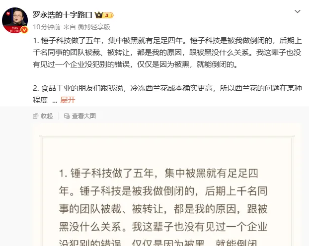 2. 食品工业的朋友们跟我说,冷冻西兰花成本确实更高,所以西兰花的问题在某种程度上是冤枉的(其他的基本都不冤,甚至不能算“黑”,因为他家大部分就是预制菜!!! 这个事实,靠撒谎、偷换概念,请黑公关都改变不了),但西兰花被大家攻击,是乱搞开放厨房后失控发生的,在那个急需对公众澄清的时候,他们的公关在哪里呢?估计是实在劝不住老板,也不能未经老板发声,只好来央求我们的同事,说能不能请你们老罗高抬贵手?我两次主动收手,其实跟这个也有一定的关系。另外,发现对方严重认知失调,当众往死里自残而不自知时,谁好意思继续跟这种人掰扯道理呢?