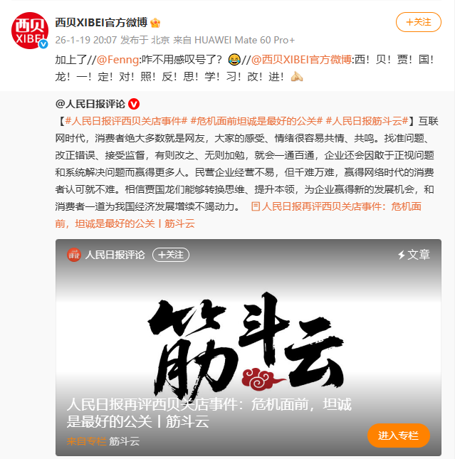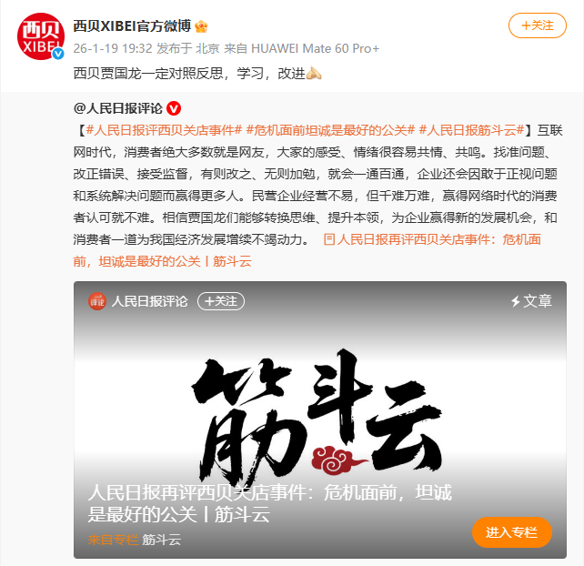 @西贝XIBEI官方微博 两度转发评论文章,称西贝贾国龙一定对照反思,学习,改进。