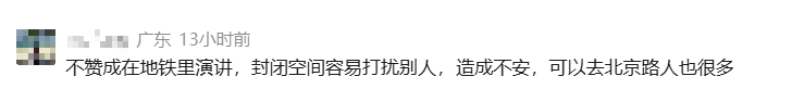 1月19日,广州地铁方面作出回应。根据广州市城市轨道交通乘客守则第十三条第八款:“禁止在出入口、通道、站厅、站台、列车车厢等城市轨道交通区域或其他城市轨道交通设施骑行平衡车、电动代步工具(不包括电动轮椅)、自行车,使用滑板和溜冰鞋,大声喧哗或者使用电子设备时外放声音等。”地铁车厢是密闭空间,乘客在地铁车厢内高声演讲等大声喧哗的行为,不仅违反乘客守则条款,对其他乘客造成困扰,甚至可能扰乱运营秩序,引起不必要恐慌。