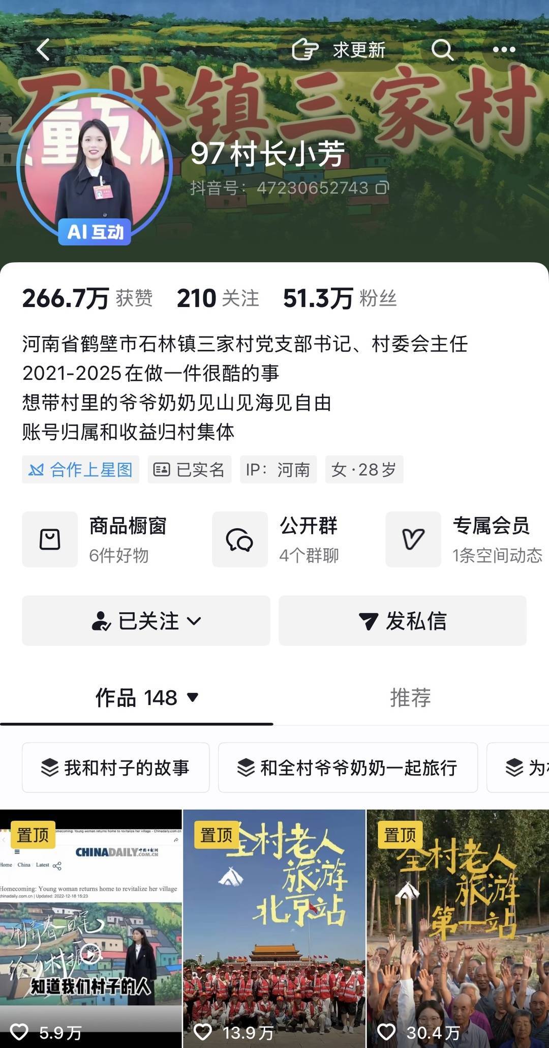 如今,张桂芳的抖音账号“97村长小芳”已吸粉51.3万,这不仅是她个人成长的刻度尺,也成为三家村的重要展示窗口。她坦言,最初开设账号就是想“发展经济”,自2025年开始接广告后,累计收益30余万元。她明确表示,“账号所有权属于村委会,相关收益归村集体所有”,除一部分钱用于支付运营小伙伴的工资,其余全部用于给村民谋福利。