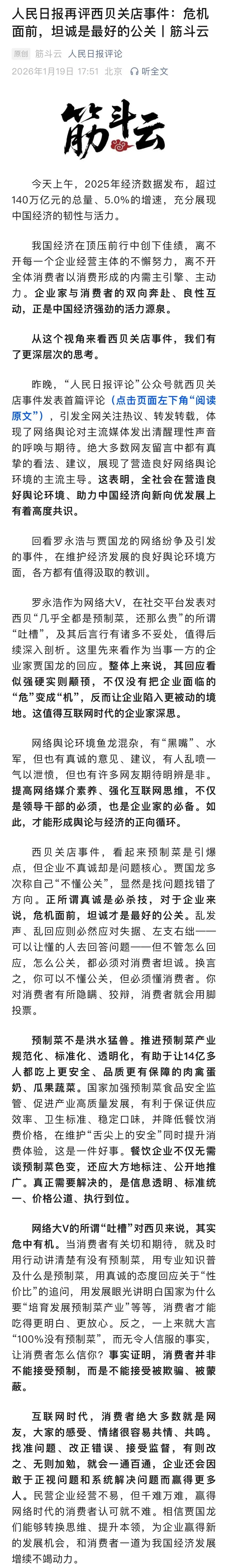 1月18日,人民日报发布评论文章《人民日报评西贝关店事件:网络舆论环境不能成为企业发展的短板》,其中提到:西贝事件早已超出口水战,罗永浩们、贾国龙们、新浪微博等平台们,都有要汲取教训的地方,“营造清朗的网络空间”绝不是一个虚设的命题,而是各方必须时刻答好的共同答卷,谁违背了这一守则,谁终将受到严厉惩罚。
