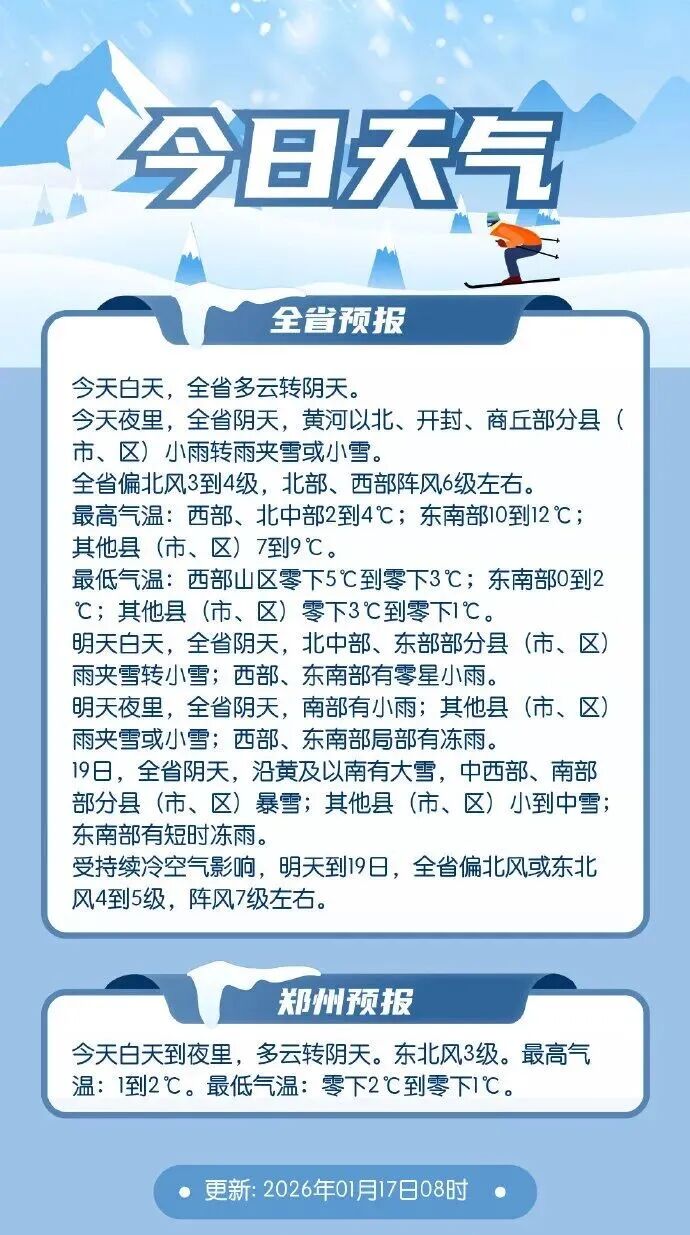雨雪:今天夜里,黄河以北、开封、商丘部分县(市、区)小雨转雨夹雪或小雪。