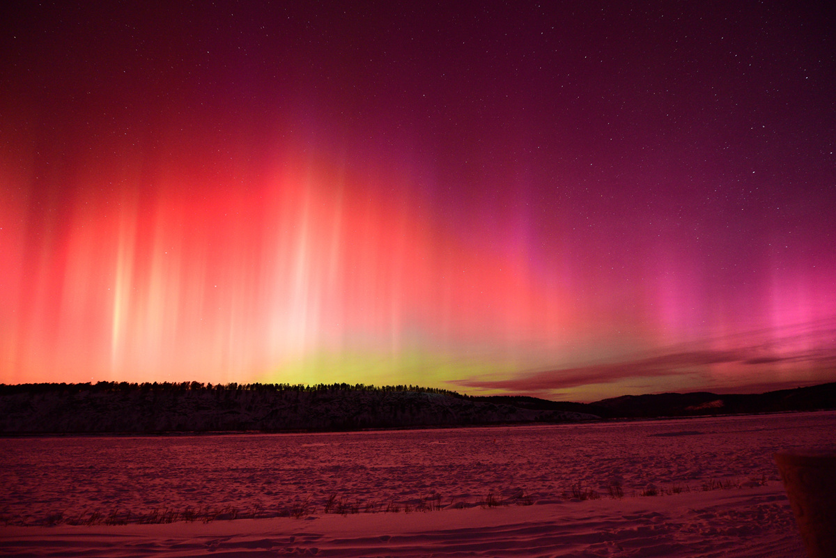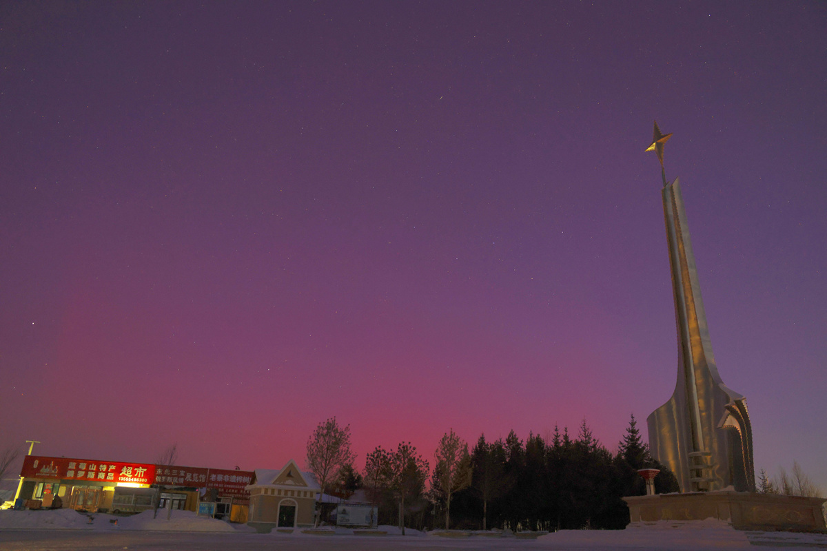 受地磁暴影响,今天凌晨,在我国位置最北、纬度最高的黑龙江漠河出现了极光美景。红绿复合极光在夜空中慢慢舞动,临近天亮变为粉红色。静谧的冬夜里,极光星空与冰封的黑龙江同框,为寒冬时节的北国风光增添了独特的浪漫色彩。(总台记者 李鑫 陈宗涵)