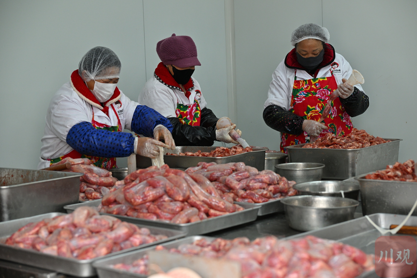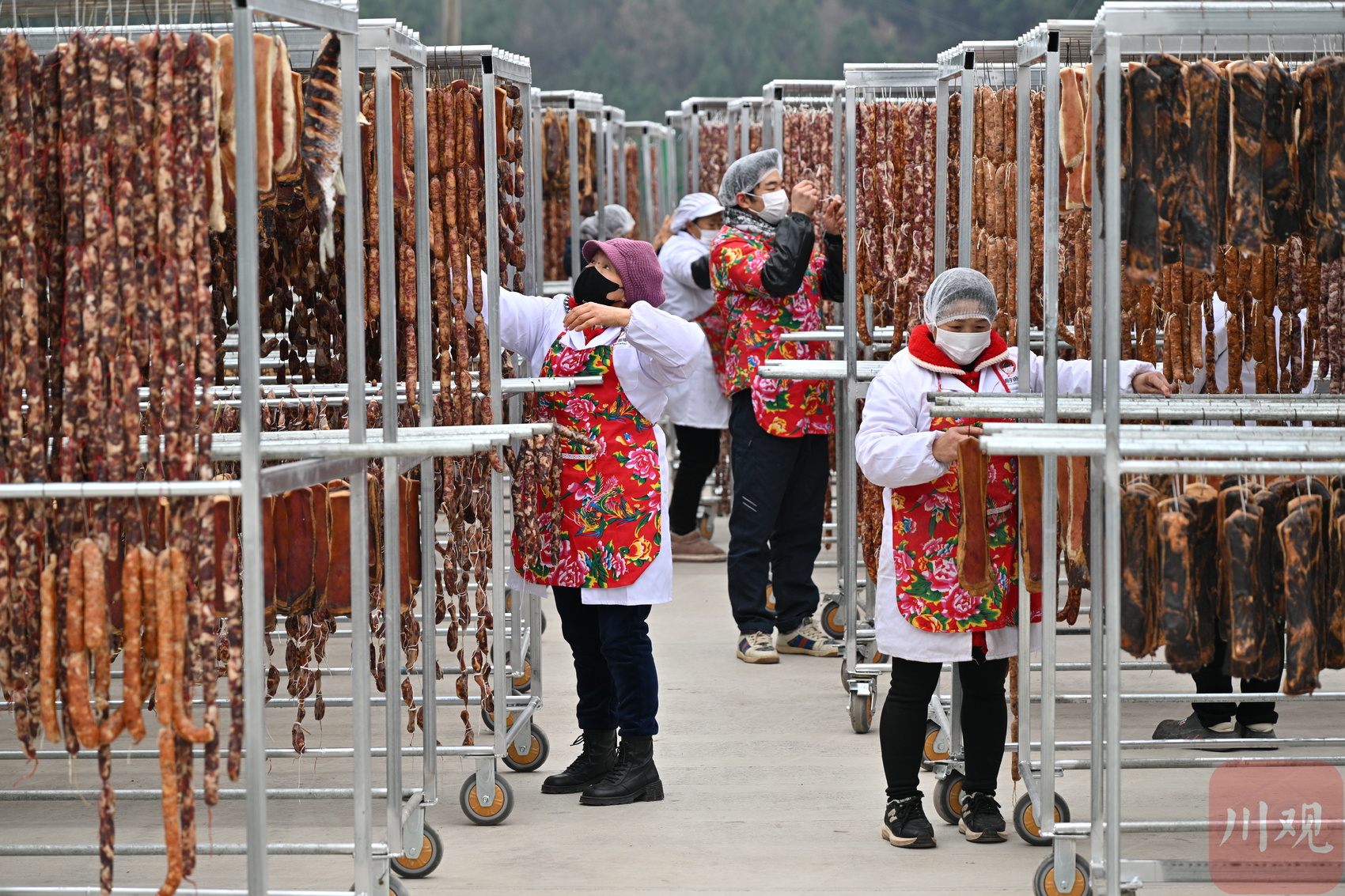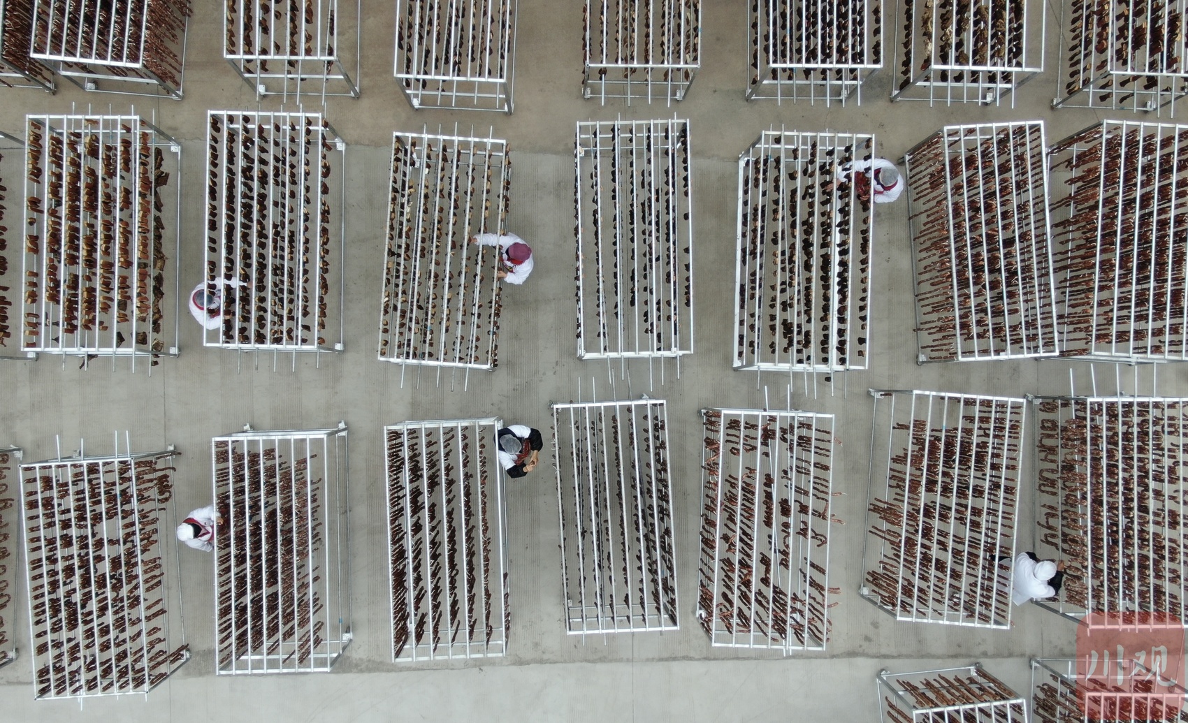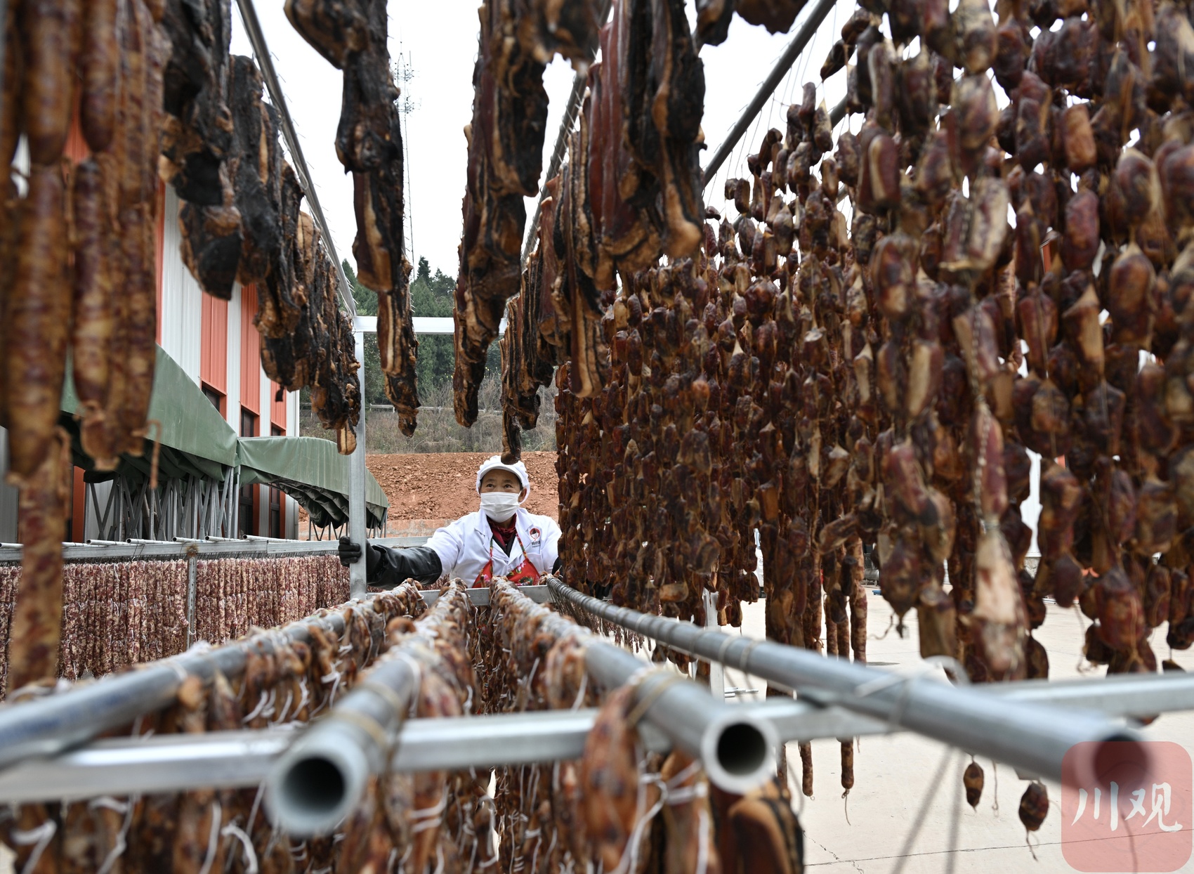 1月20日,大寒,位于德阳市旌阳区新中镇桂花村的四川妈仔食品有限责任公司晒场上,一排排色泽诱人的腊肠、腊肉、腊排整齐晾晒,工人们忙着翻晒、整理,一派热火朝天的生产景象。这家食品企业,正开足马力赶制春节订单。