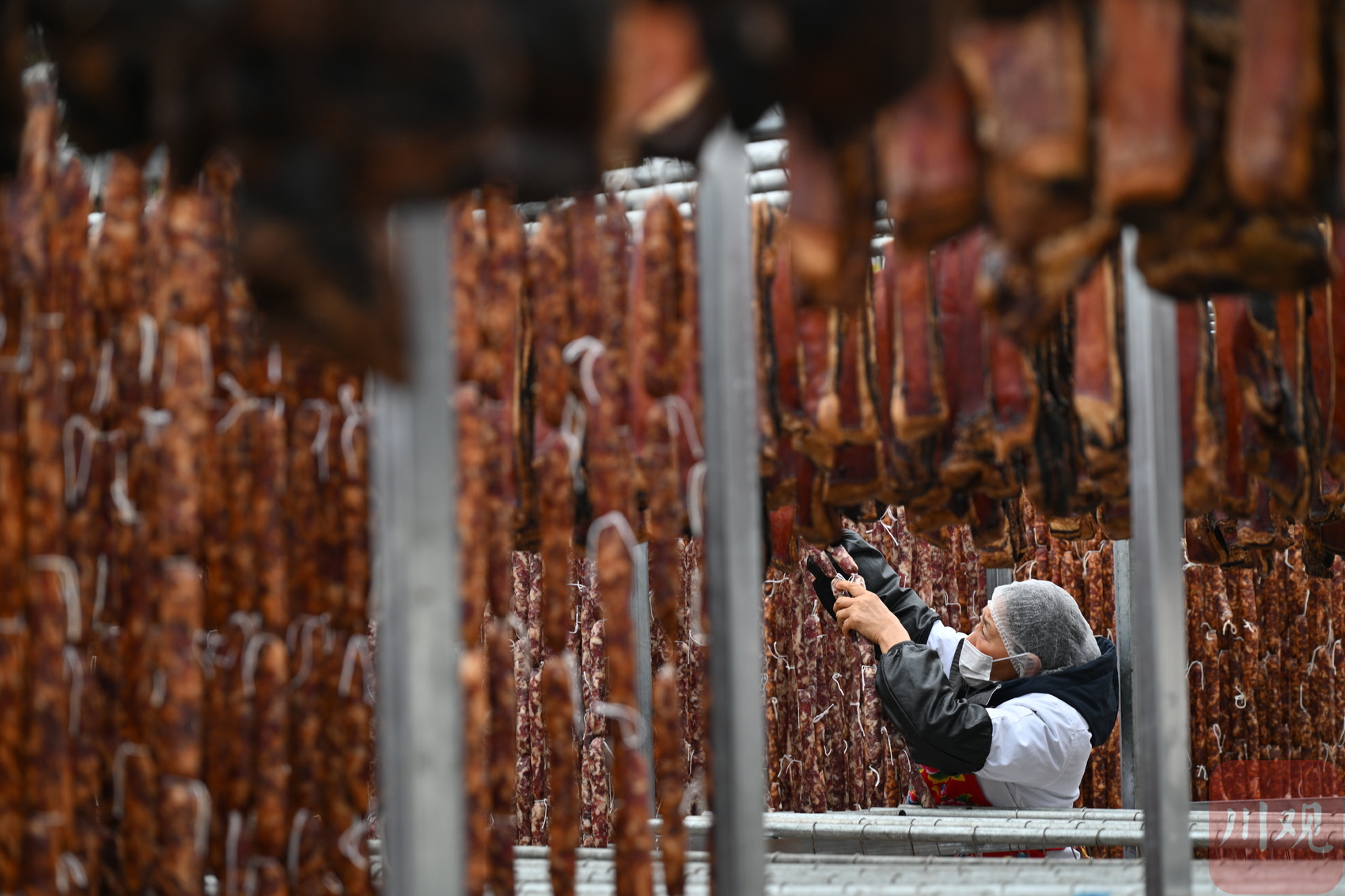一排排色泽诱人的腊肠、腊肉、腊排整齐晾晒,工人们忙着翻晒、整理。
