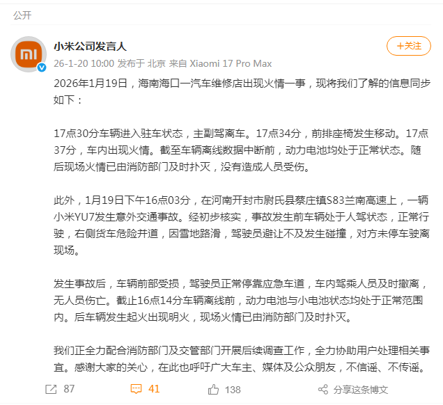 我们正全力配合消防部门及交管部门开展后续调查工作,全力协助用户处理相关事宜。感谢大家的关心,在此也呼吁广大车主、媒体及公众朋友,不信谣、不传谣。