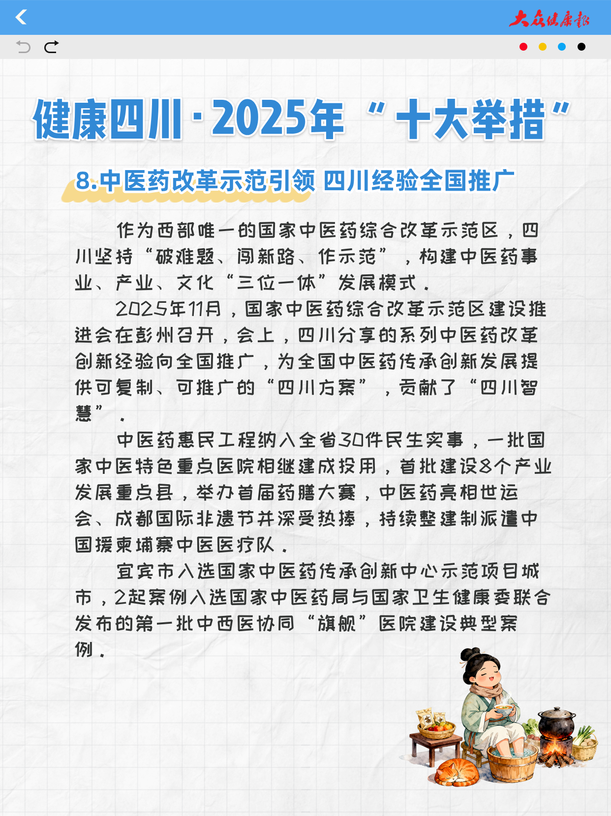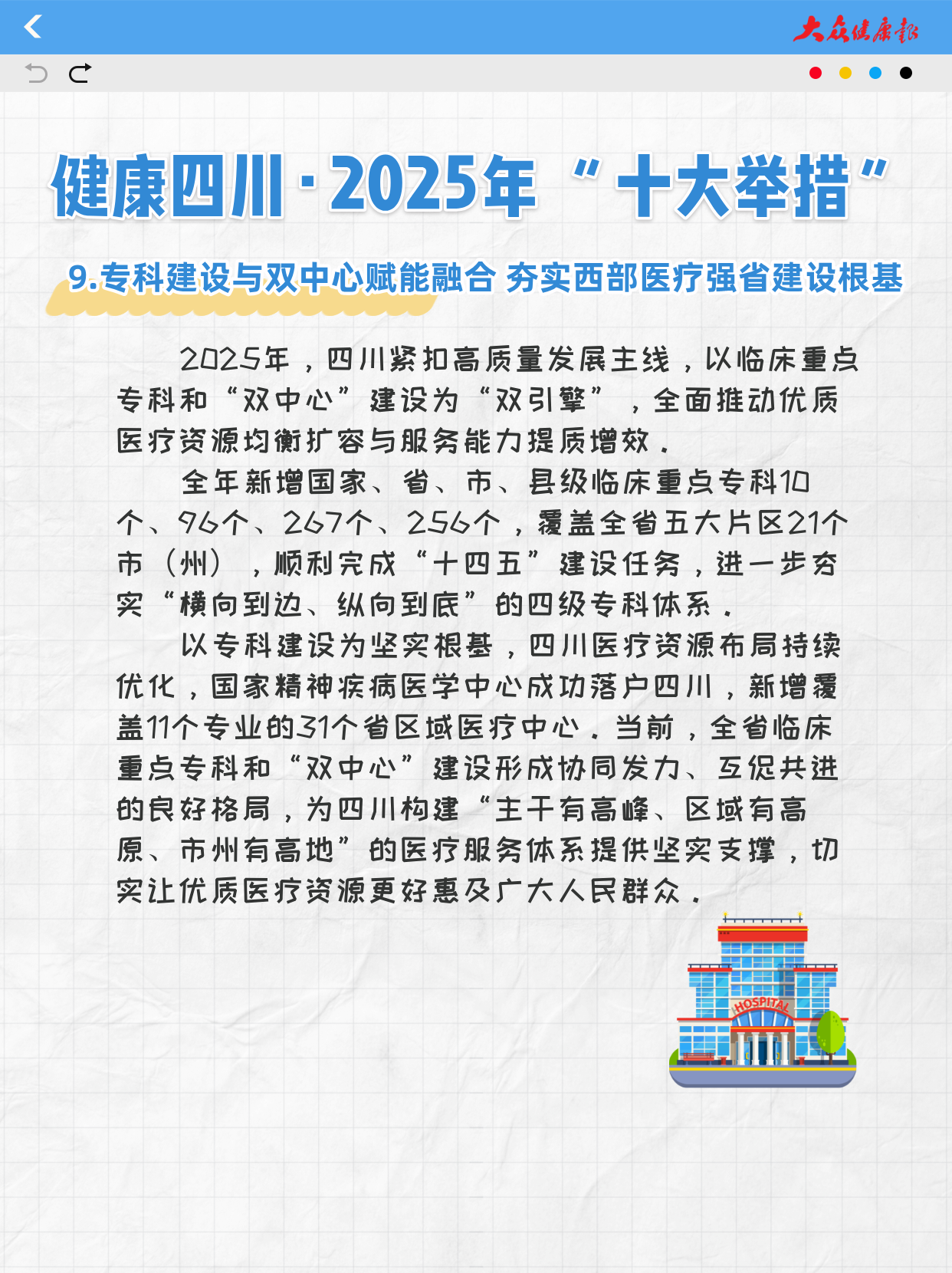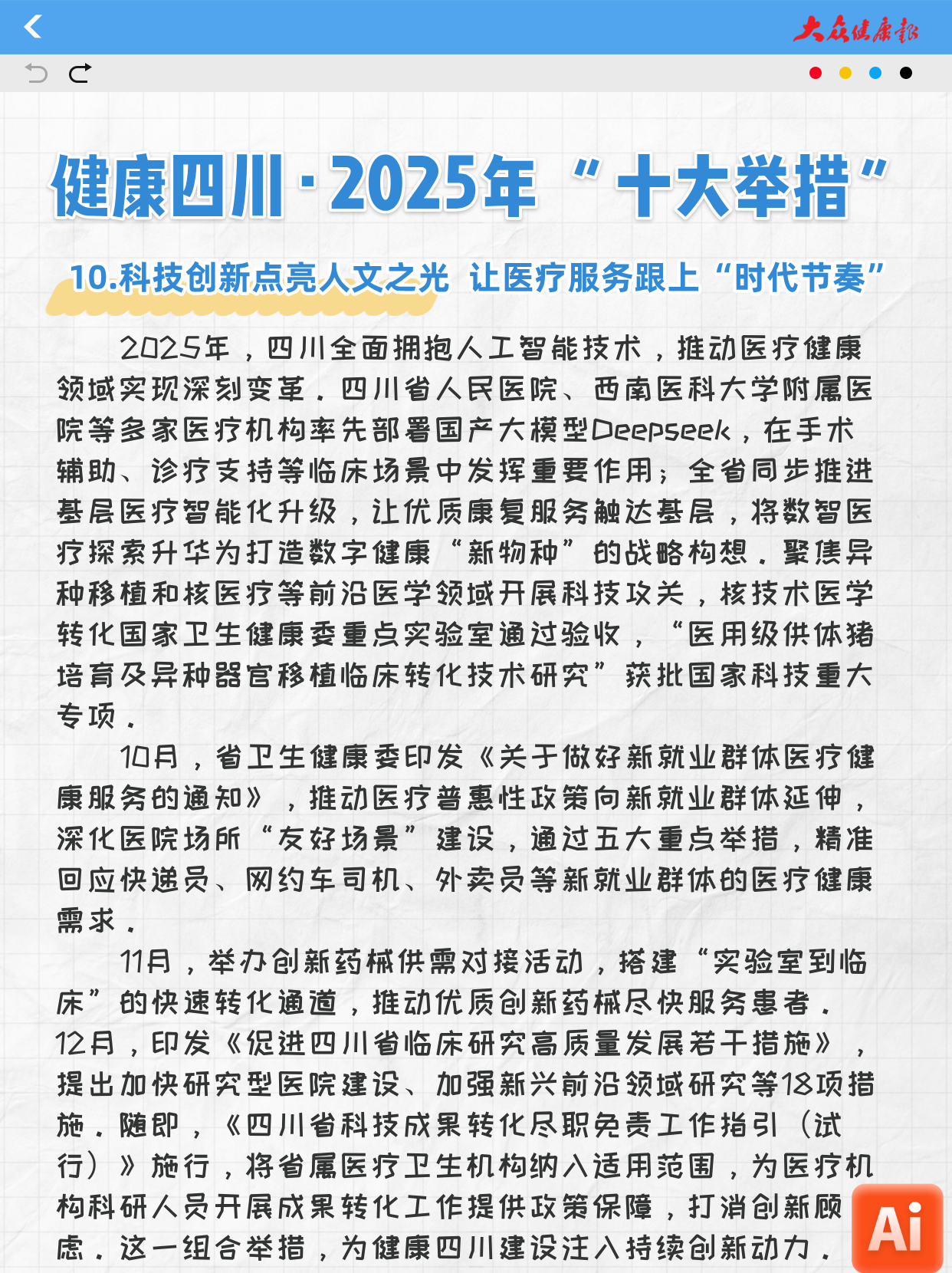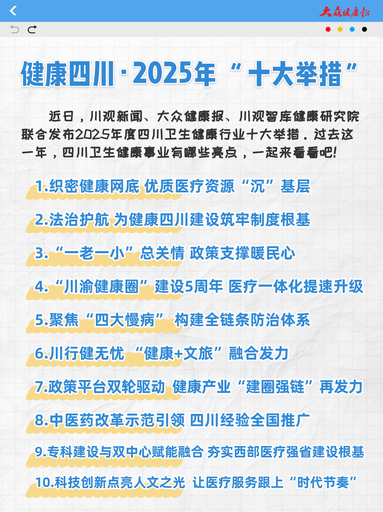 近日,川观新闻、大众健康报、川观智库健康研究院联合发布2025年度四川卫生健康行业十大举措。过去这一年,四川卫生健康事业有哪些亮点,一起来看看吧!