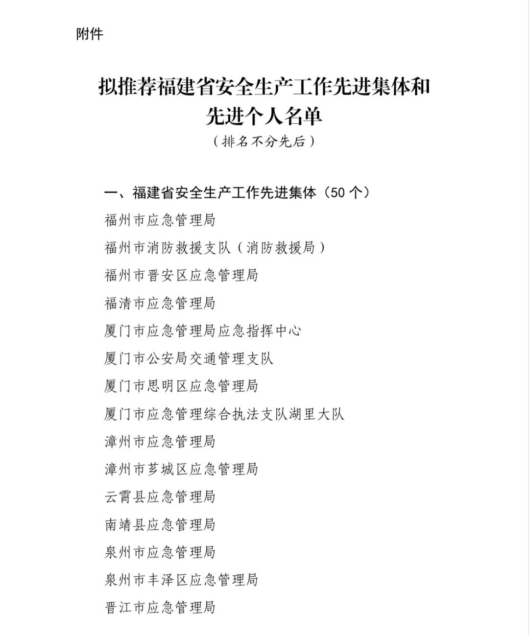 根据《福建省功勋荣誉表彰工作领导小组办公室关于印发省级评比表彰项目目录的通知》(闽功勋荣誉办发〔2024〕1号)、《福建省功勋荣誉表彰工作领导小组办公室关于公布2025年全省评比表彰项目的通知》(闽功勋荣誉办发〔2025〕1号)等要求,经研究,拟推荐下列对象为福建省安全生产工作先进集体和先进个人(详见附件)。现予以公示,公示时间5个工作日(2026年1月19日至1月23日)。